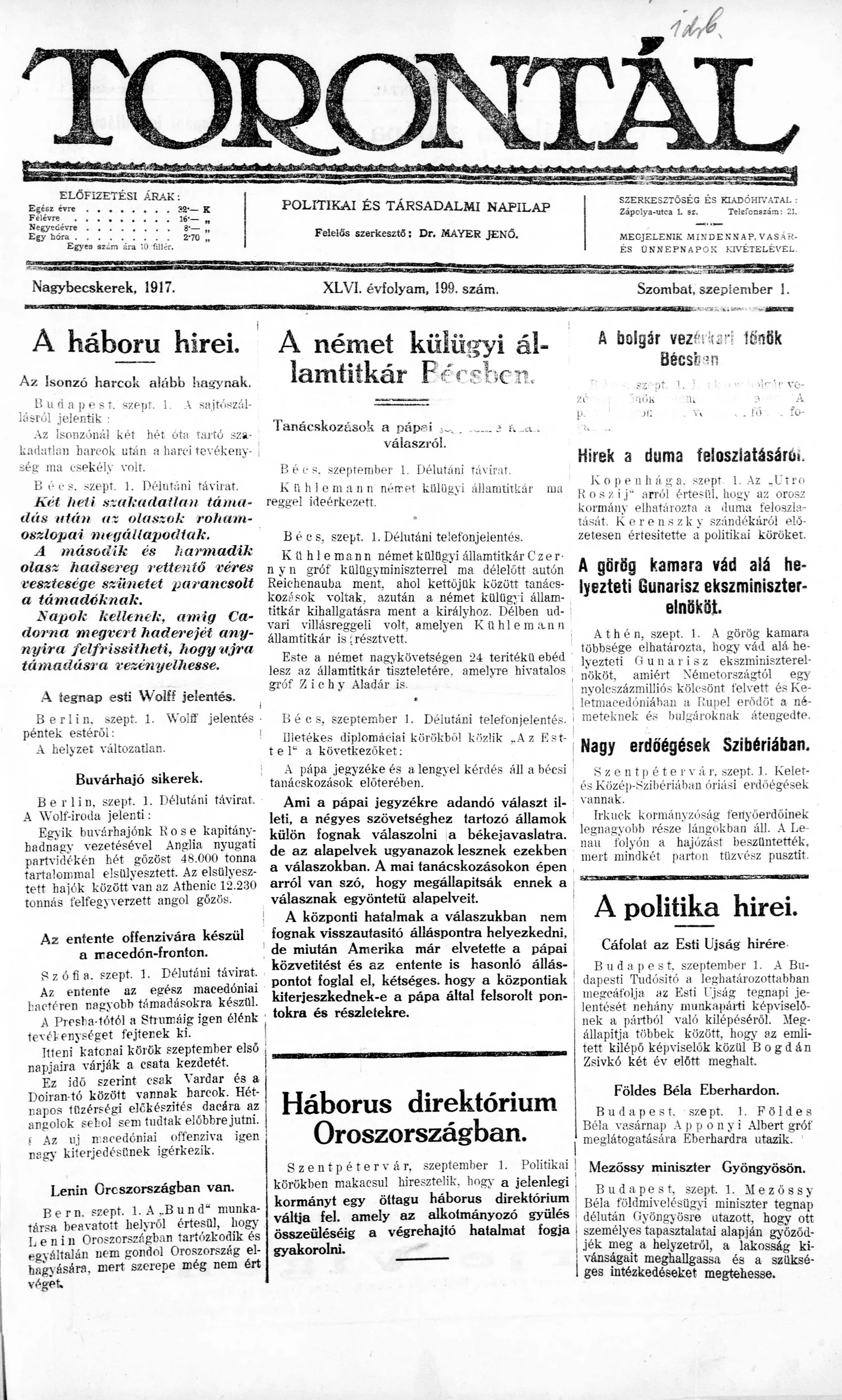 Torontál, 46. évf. 1917. szeptember 1. 199. sz.
