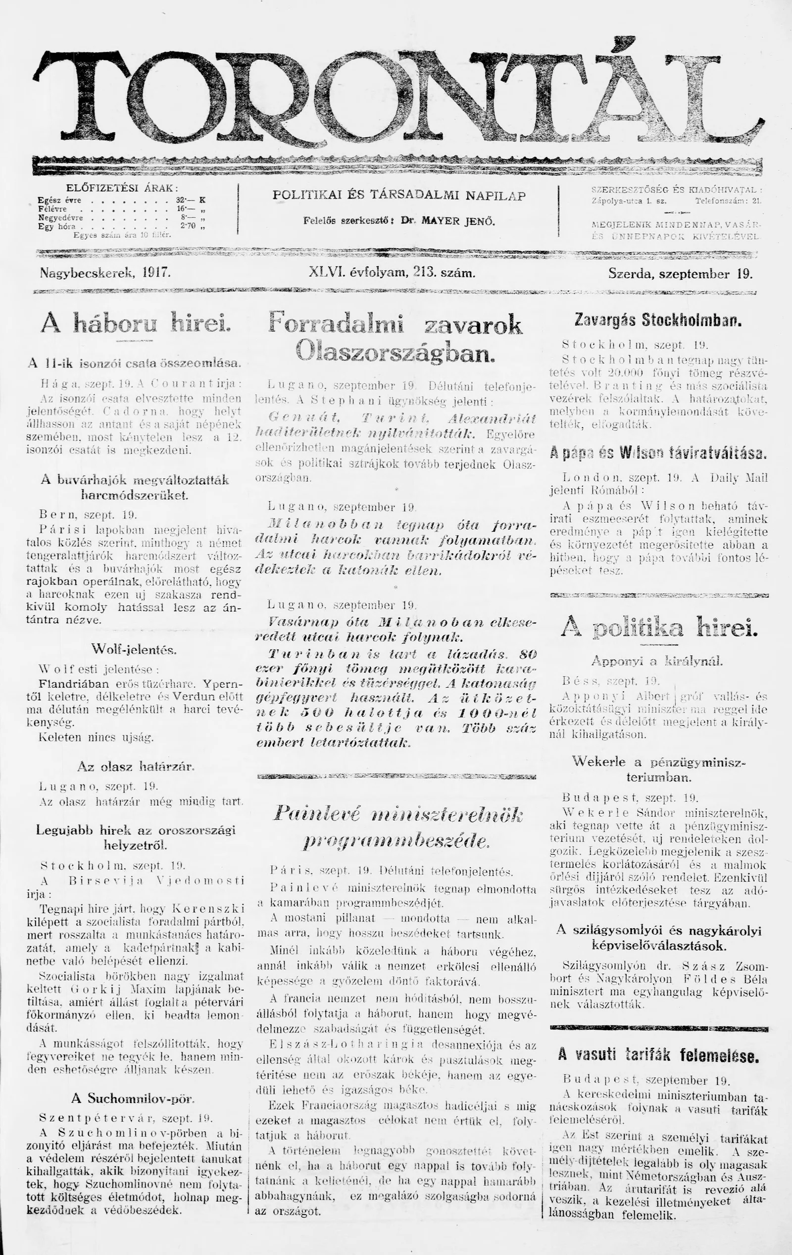 Torontál, 46. évf. 1917. szeptember 19. 213. sz.