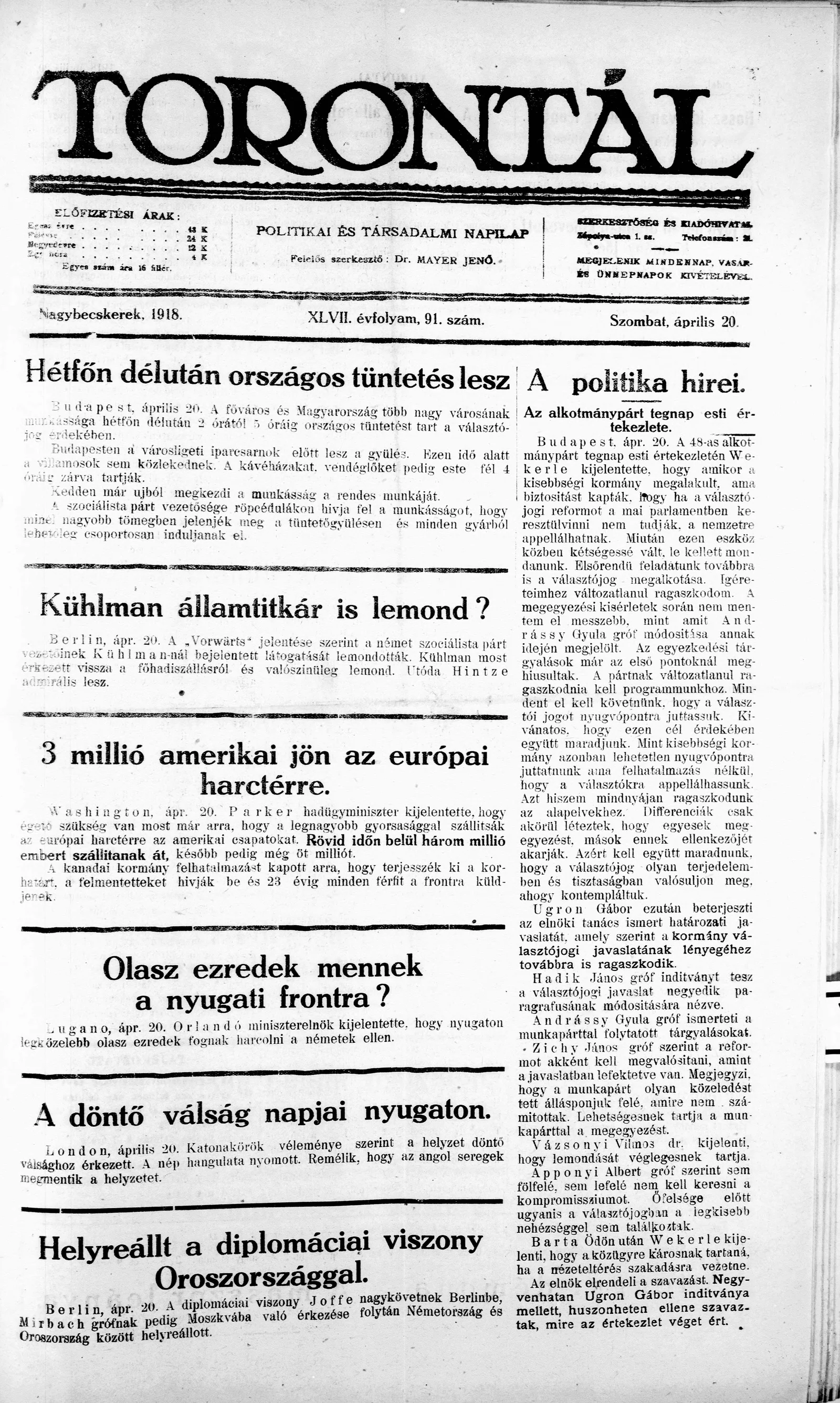 Torontál, 47. évf. 1918. április 20. 91. sz.