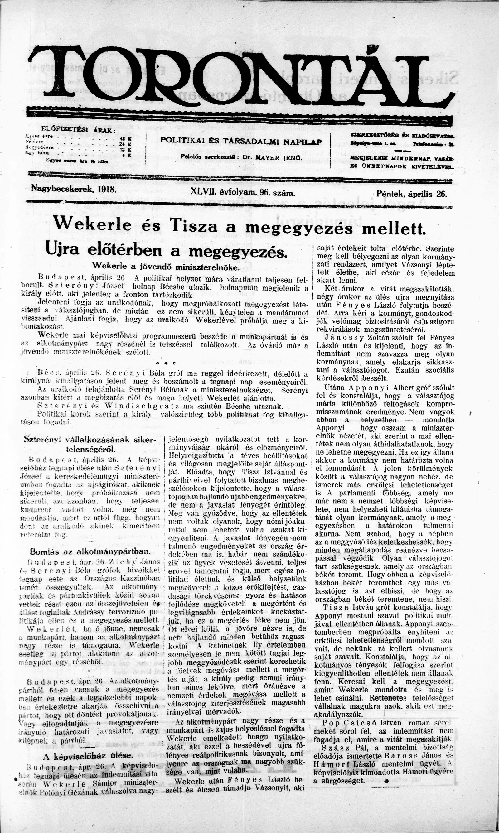 Torontál, 47. évf. 1918. április 26. 96. sz.