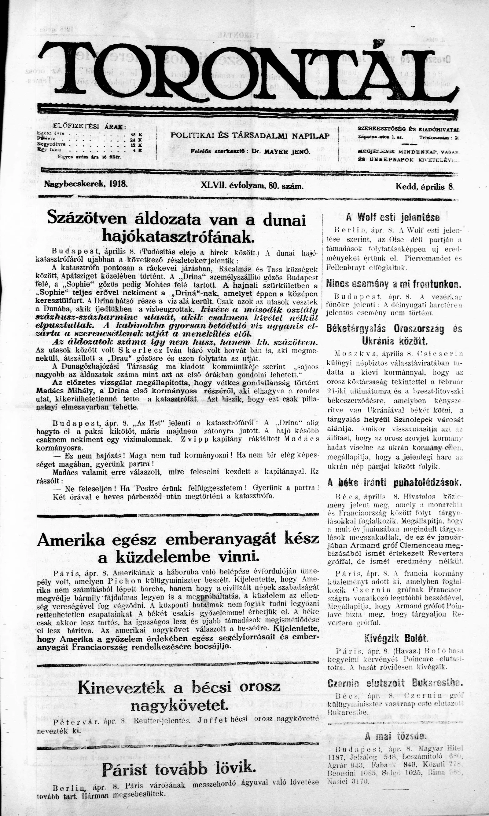 Torontál, 47. évf. 1918. április 8. 80. sz.