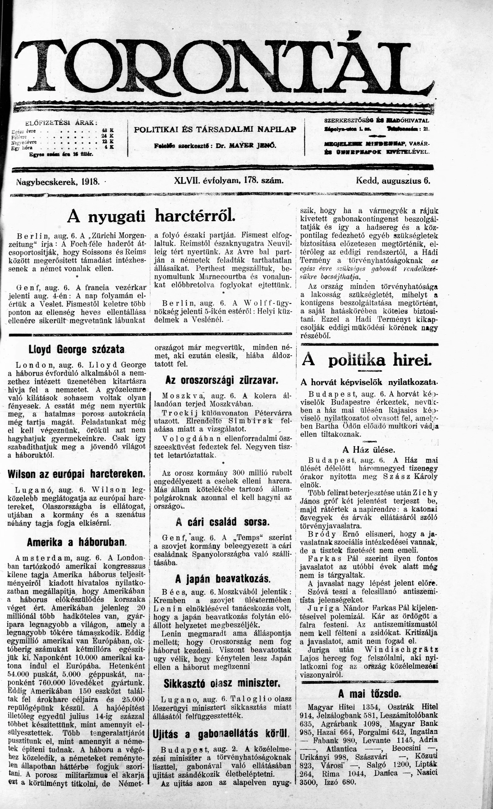 Torontál, 47. évf. 1918. augusztus 6. 178. sz.