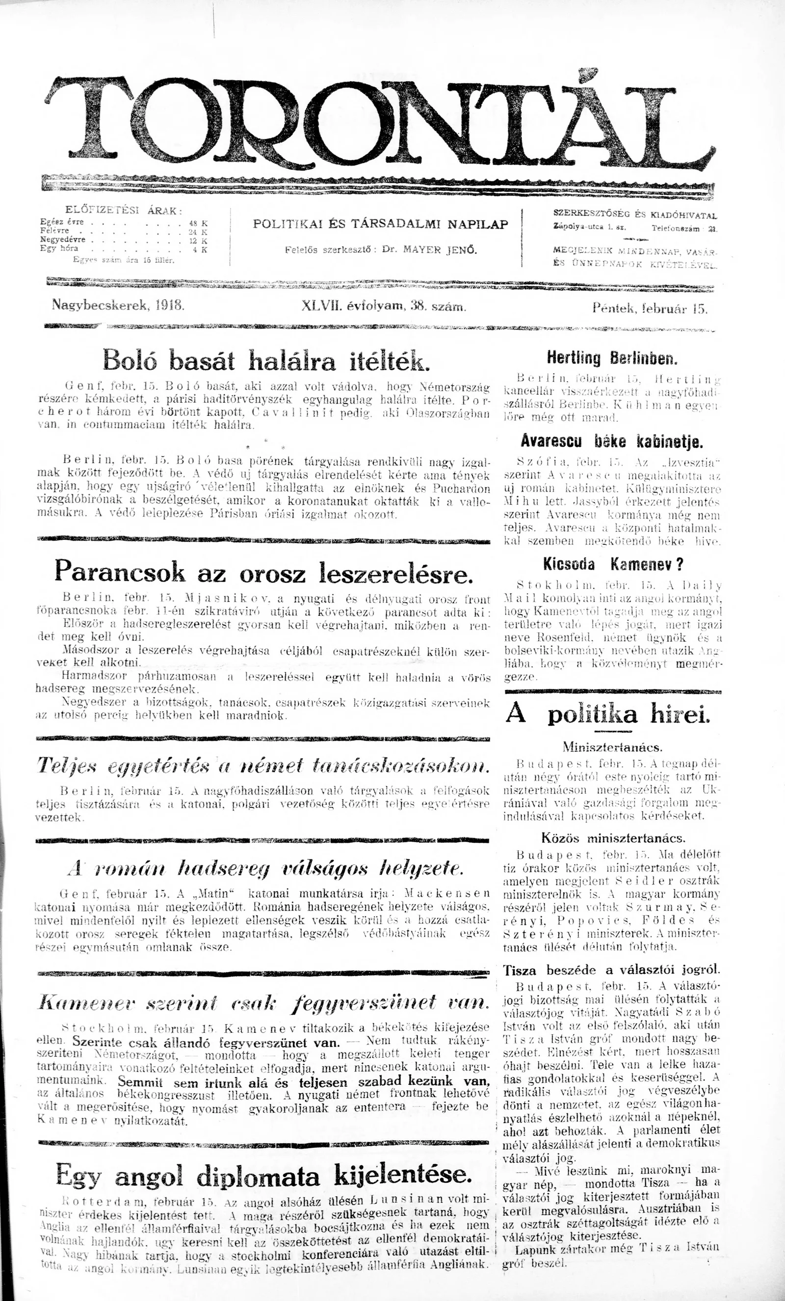 Torontál, 47. évf. 1918. február 15. 38. sz.