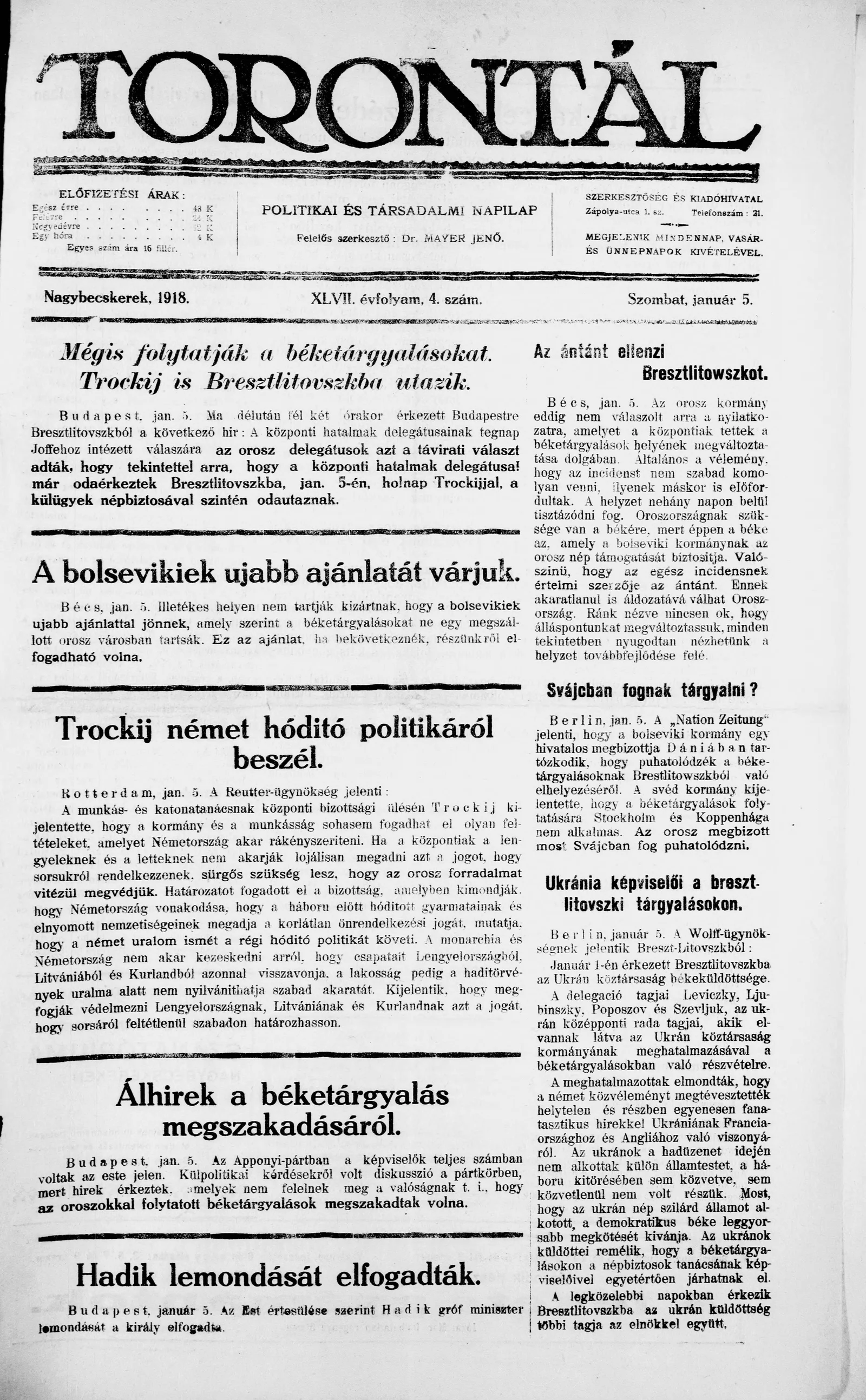 Torontál, 47. évf. 1918. január 5. 4. sz.