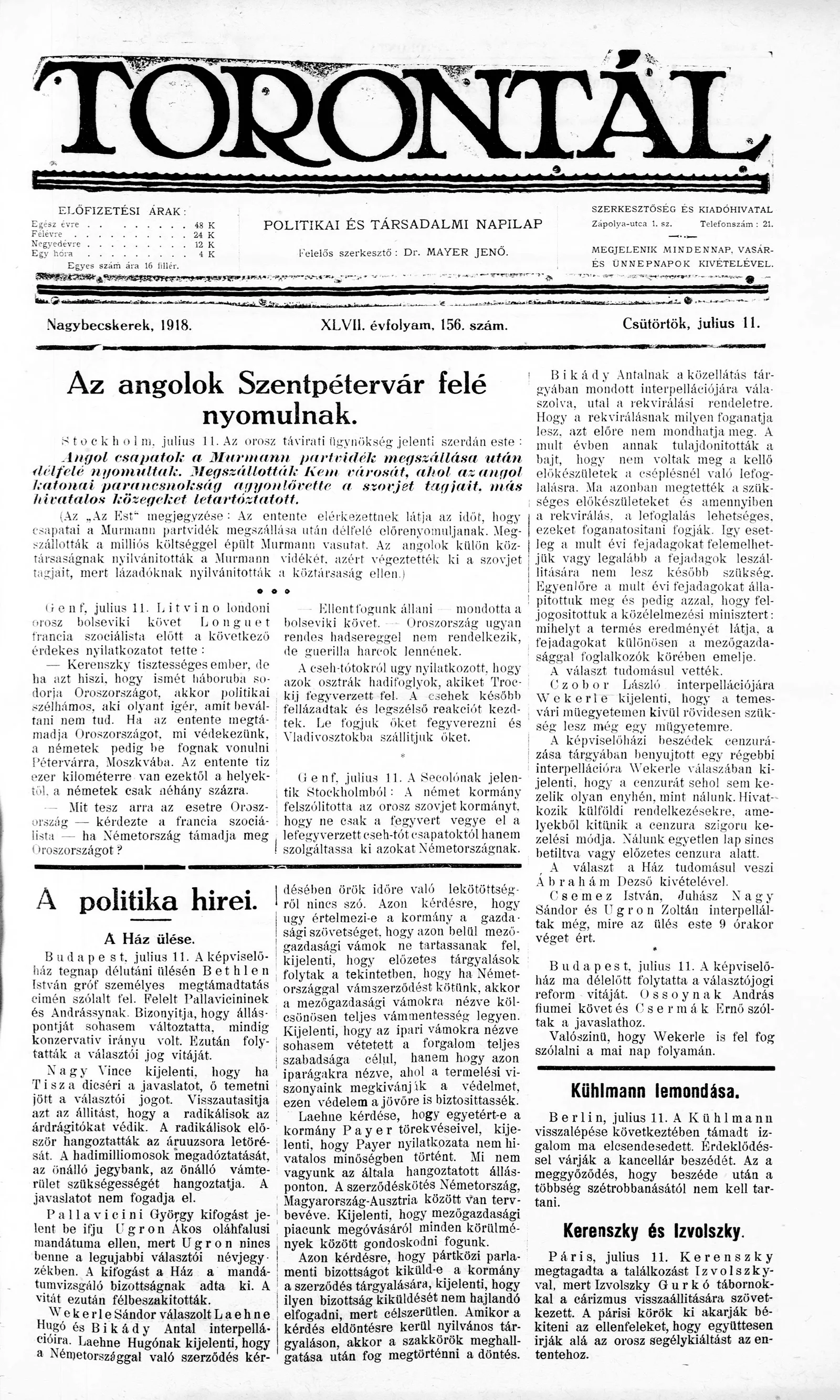 Torontál, 47. évf. 1918. július 11. 156. sz.
