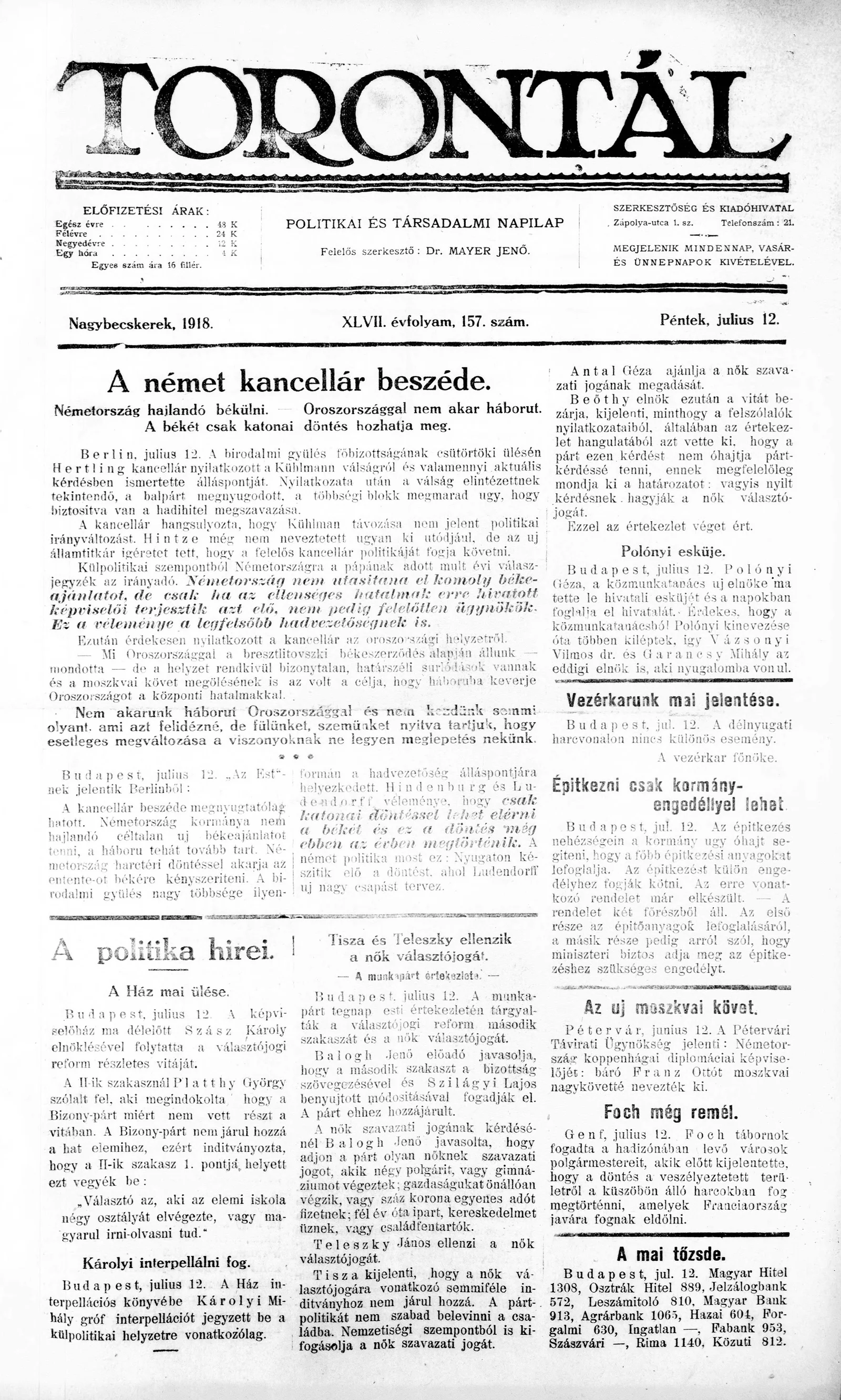 Torontál, 47. évf. 1918. július 12. 157. sz.