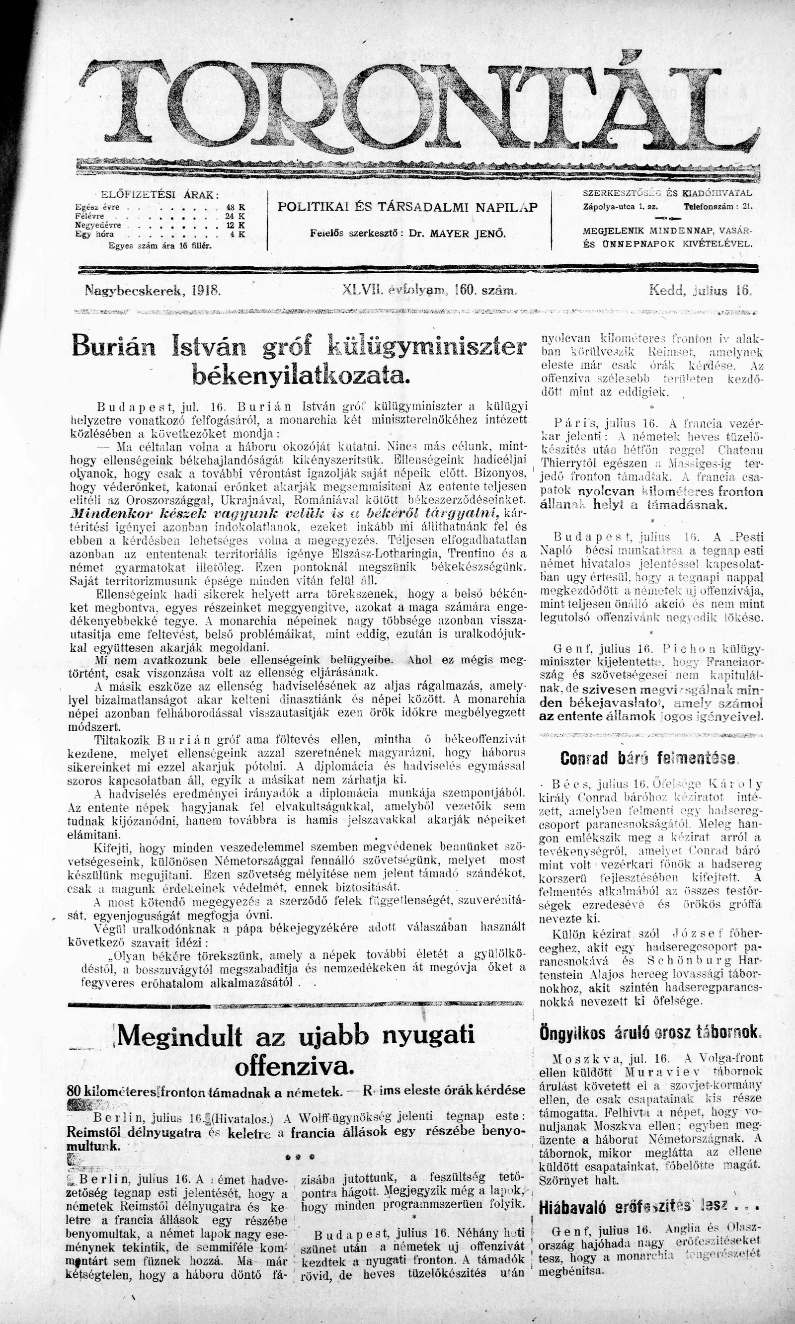 Torontál, 47. évf. 1918. július 16. 160. sz.