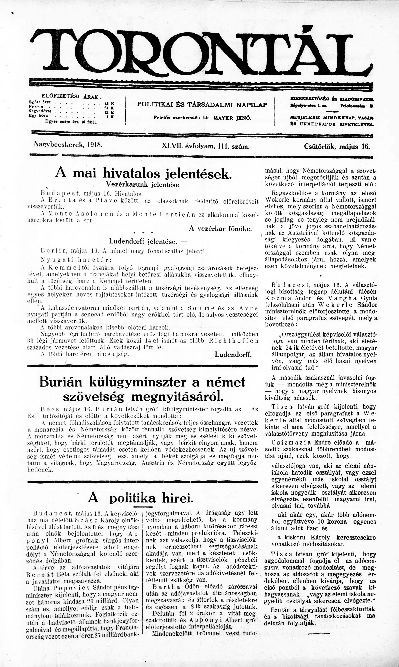 Torontál, 47. évf. 1918. május 16. 111. sz.