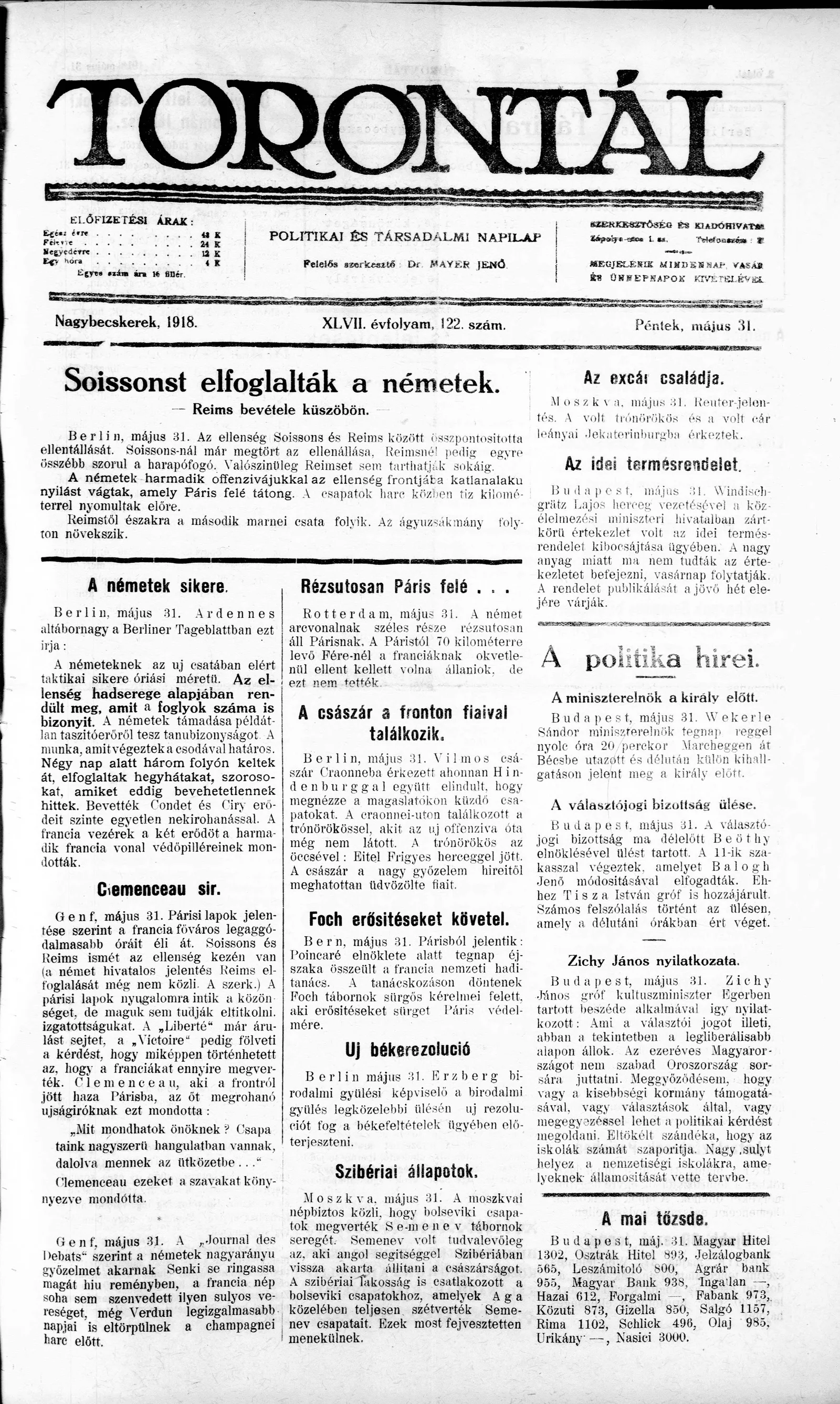 Torontál, 47. évf. 1918. május 31. 122. sz.