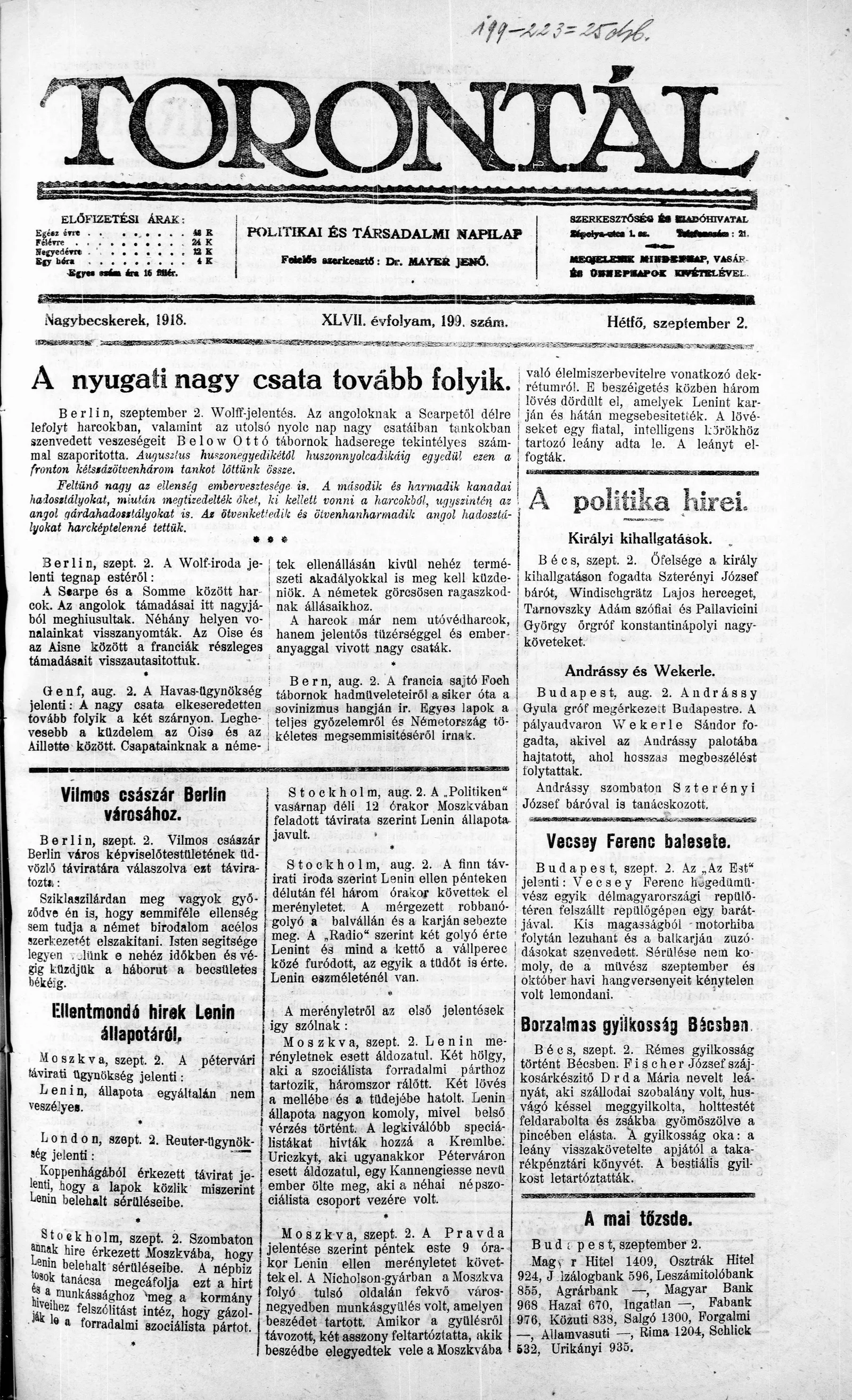 Torontál, 47. évf. 1918. szeptember 2. 199. sz.
