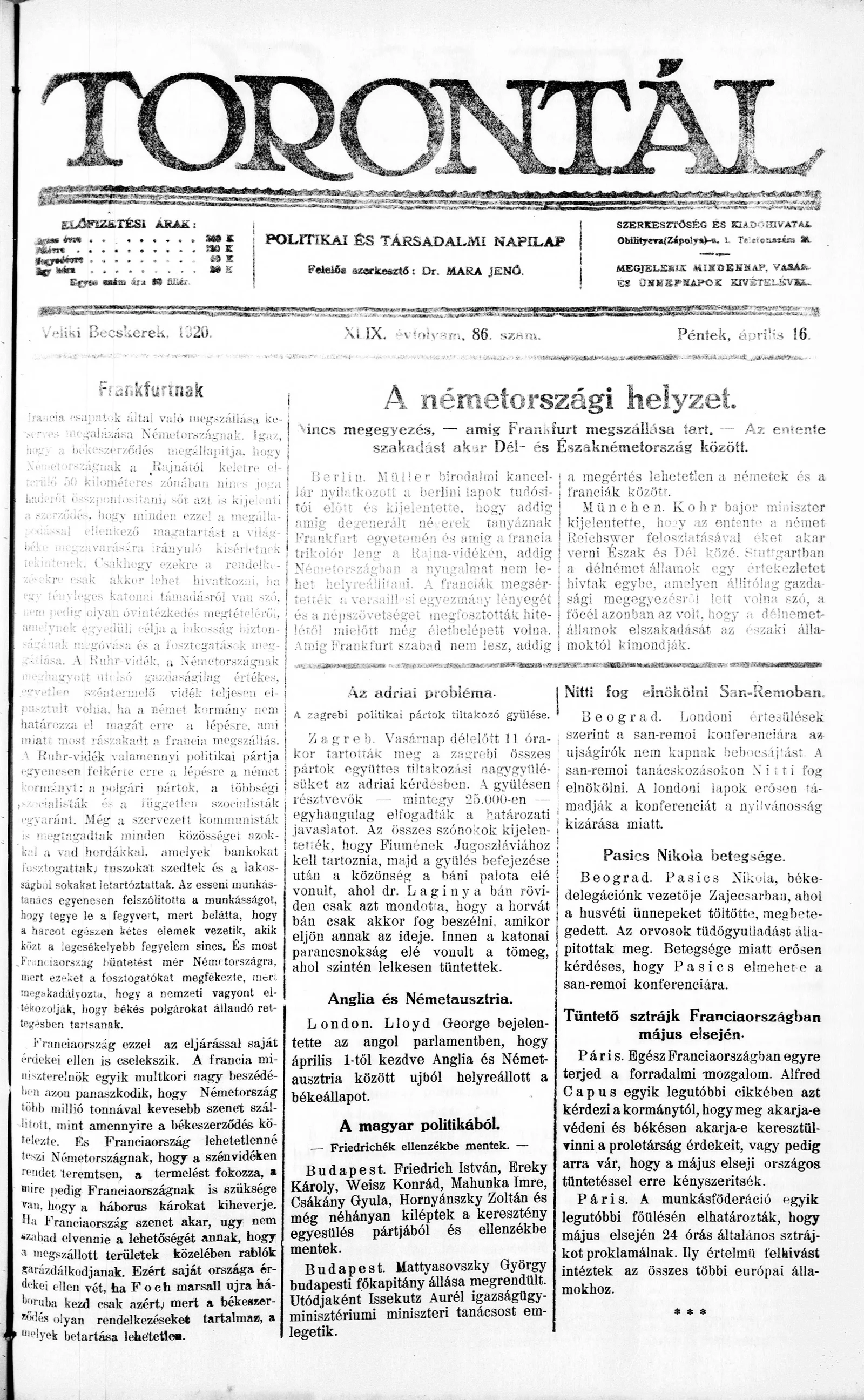 Torontál, 49. évf. 1920. április 16. 86. sz.