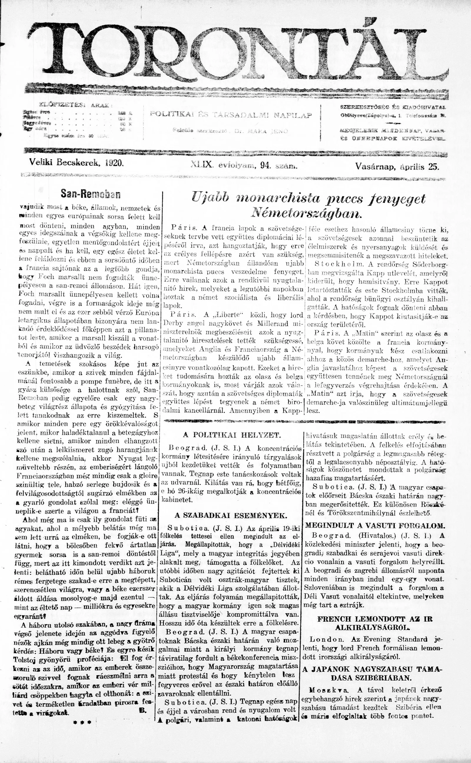Torontál, 49. évf. 1920. április 25. 94. sz.