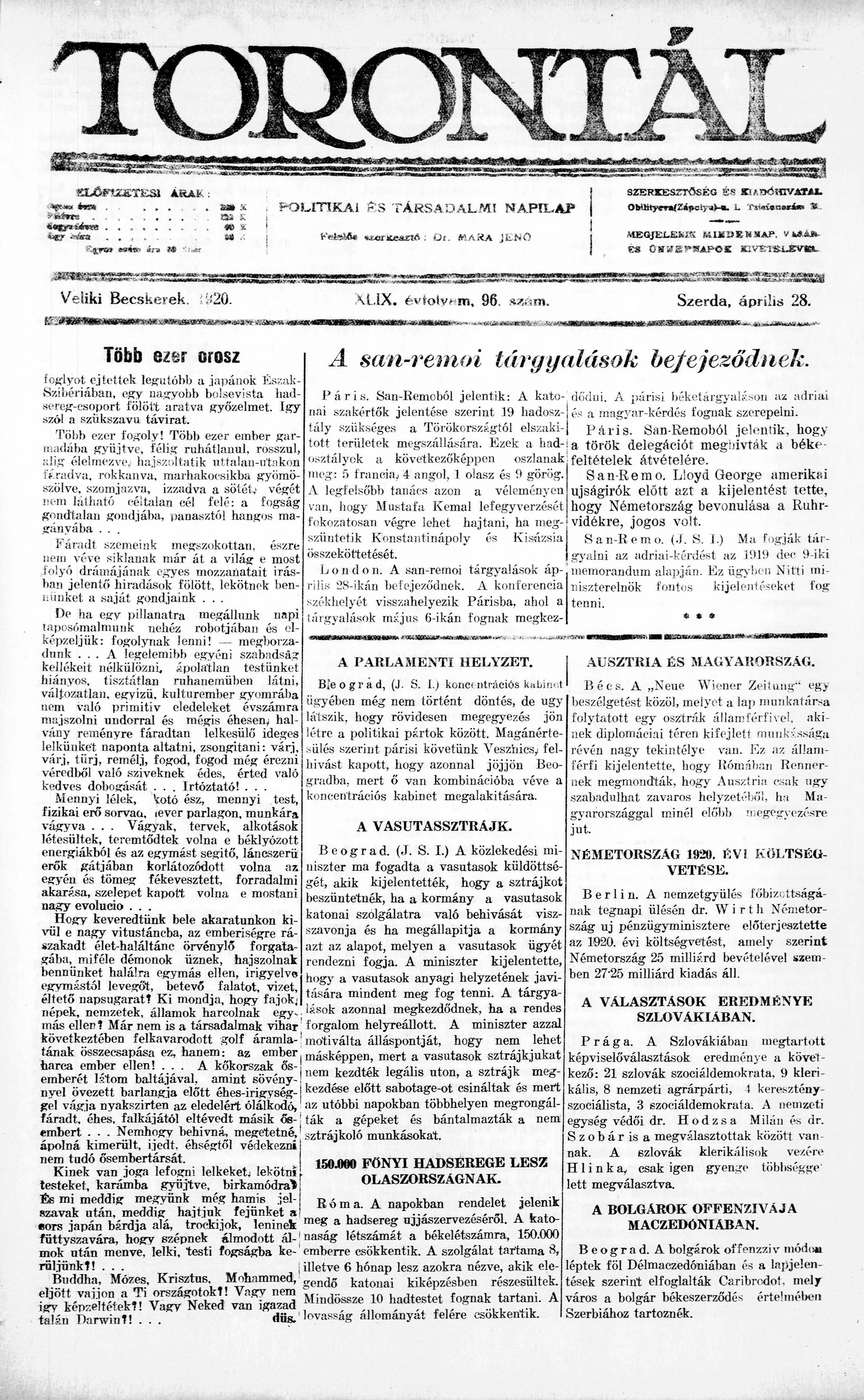 Torontál, 49. évf. 1920. április 28. 96. sz.