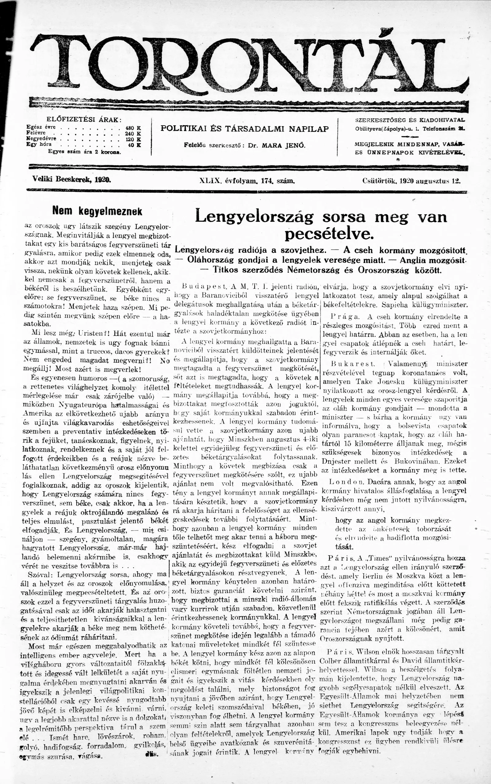 Torontál, 49. évf. 1920. augusztus 12. 174. sz.