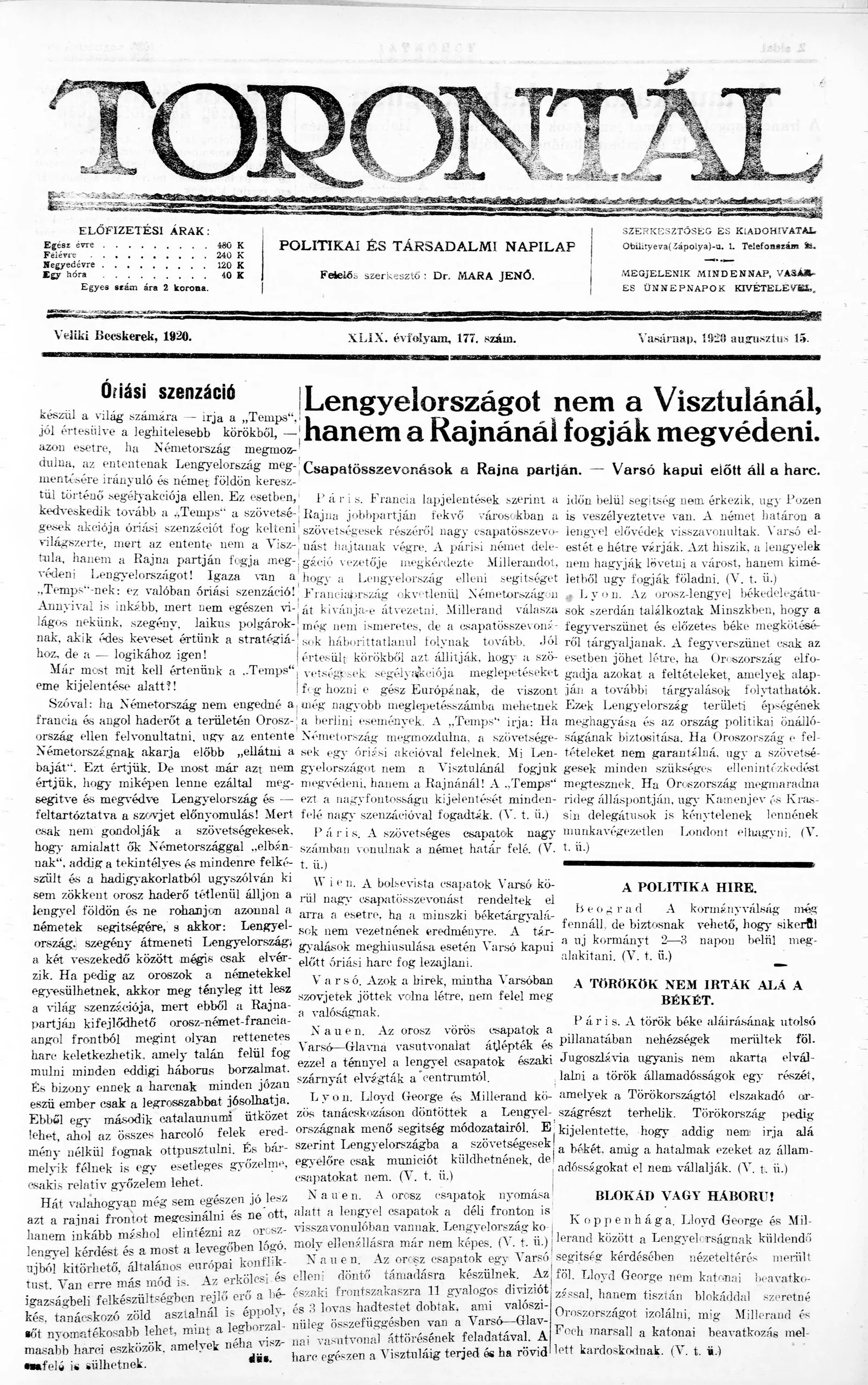 Torontál, 49. évf. 1920. augusztus 15. 177. sz.