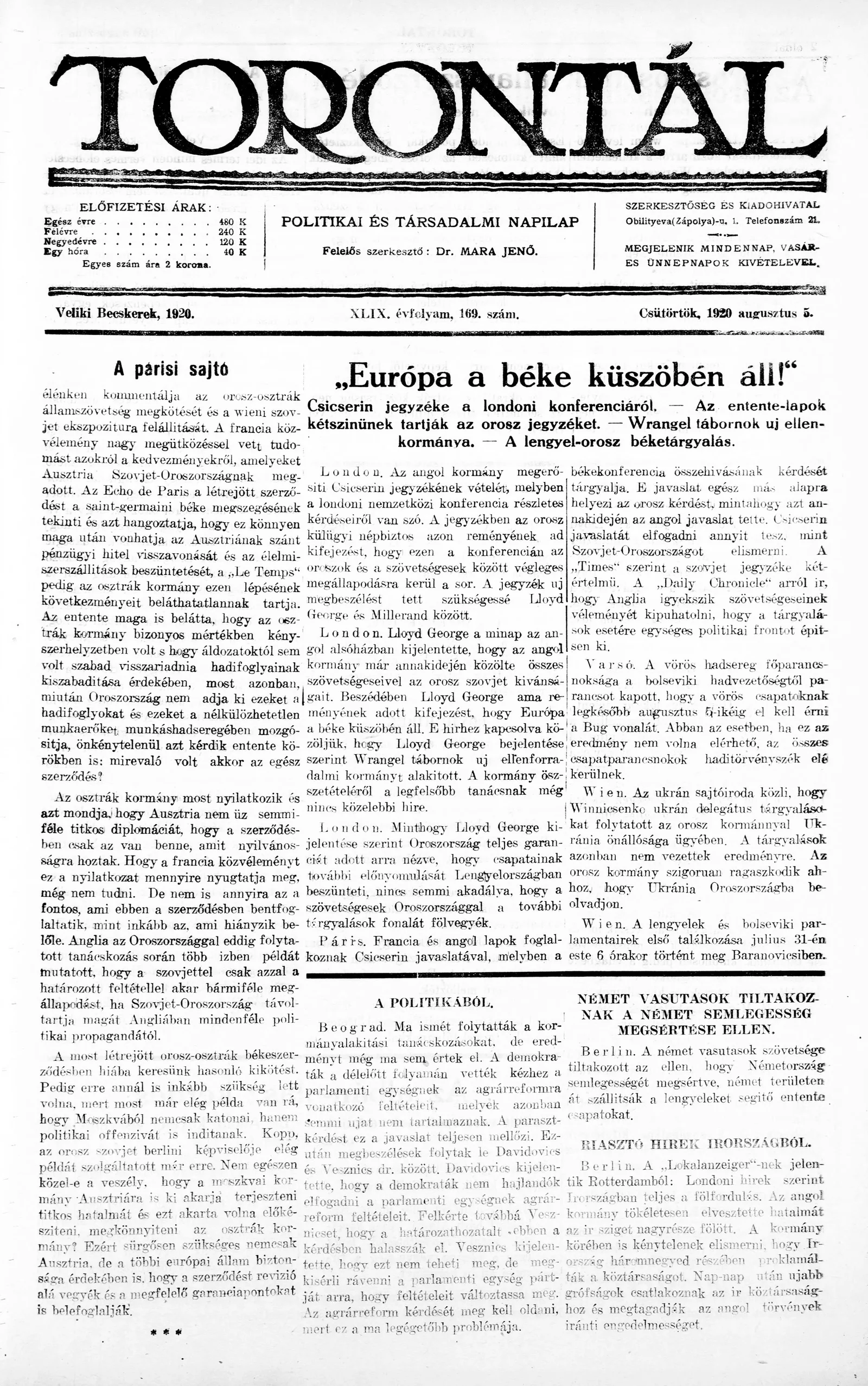 Torontál, 49. évf. 1920. augusztus 5. 169. sz.