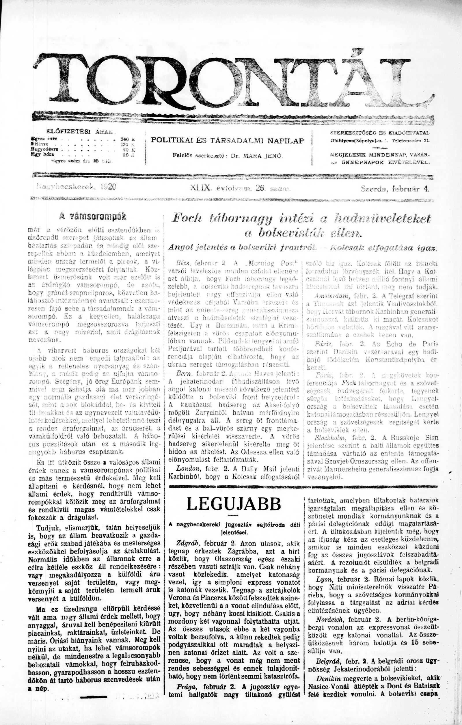 Torontál, 49. évf. 1920. február 4. 26. sz.
