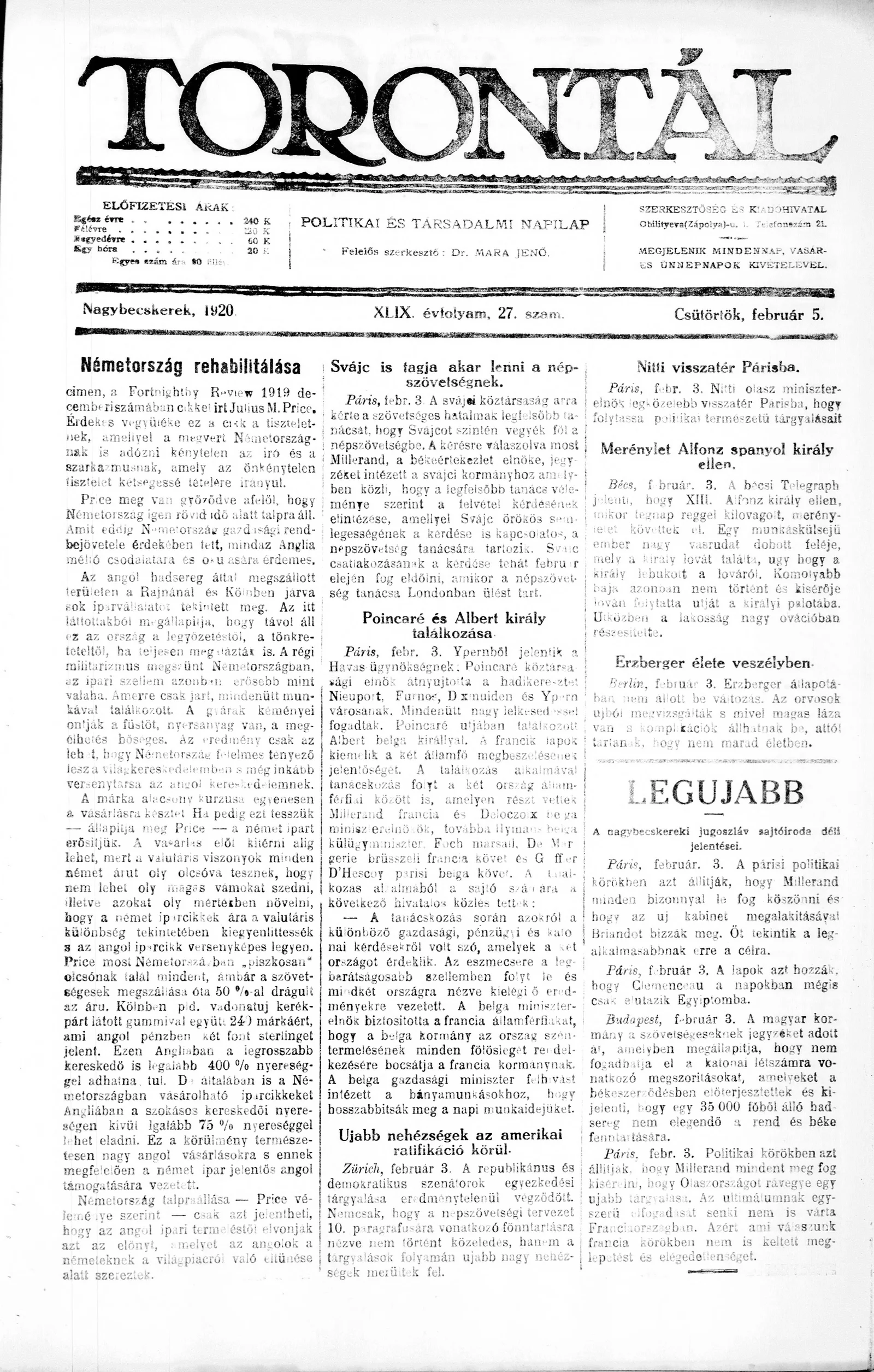 Torontál, 49. évf. 1920. február 5. 27. sz.