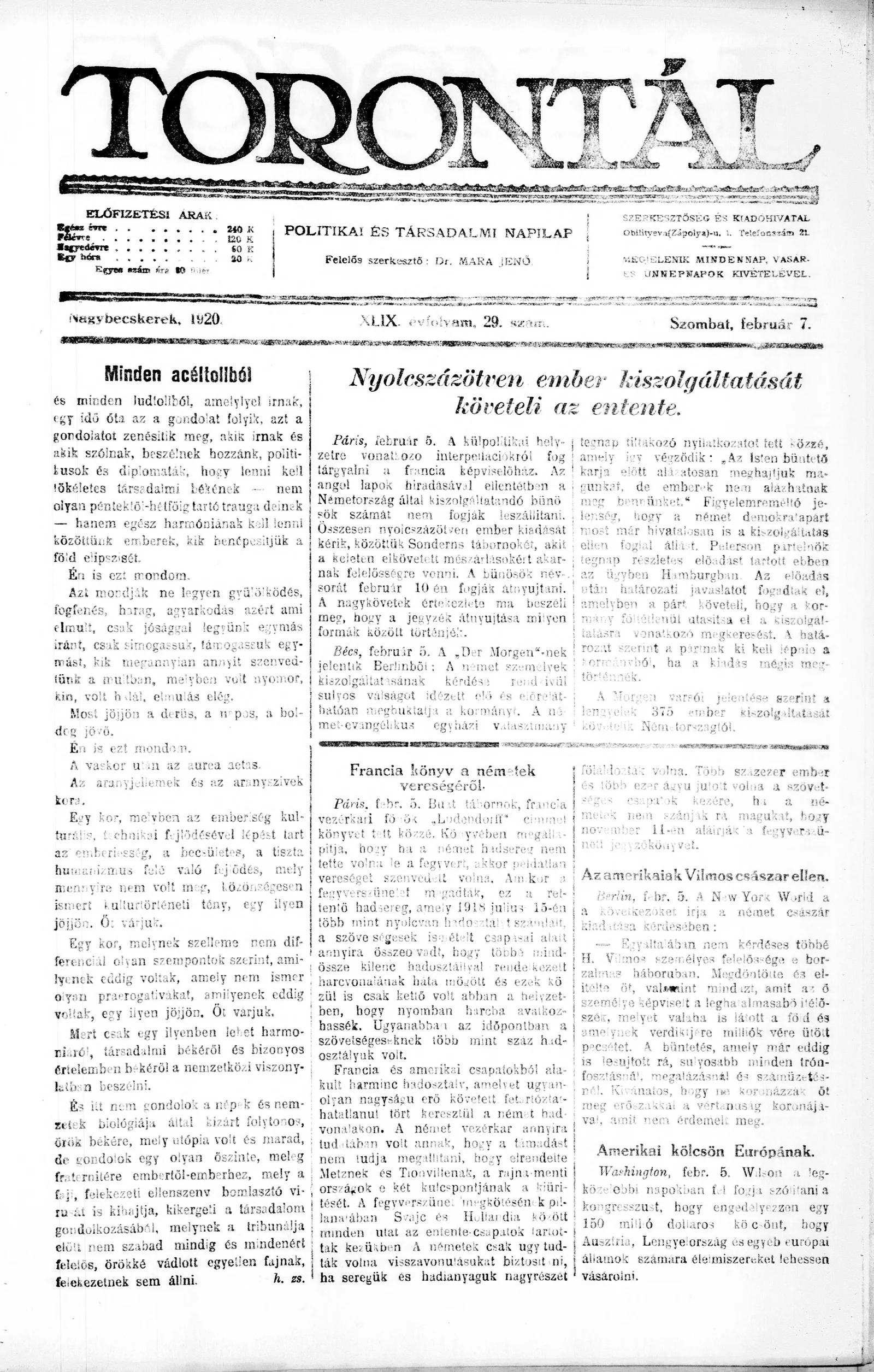 Torontál, 49. évf. 1920. február 7. 29. sz.