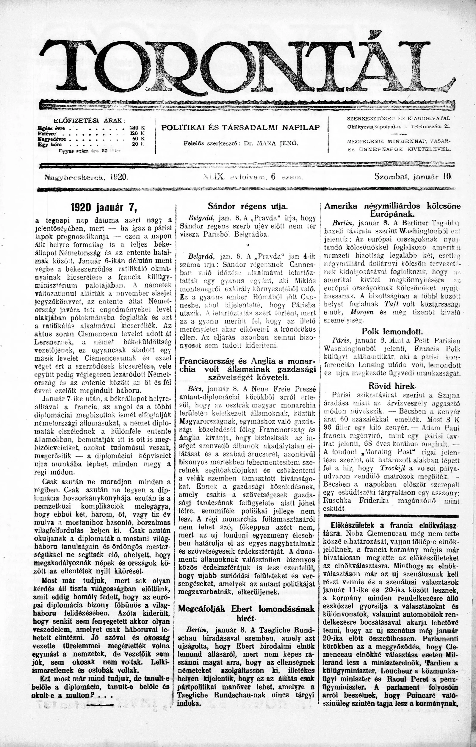 Torontál, 49. évf. 1920. január 10. 6. sz.