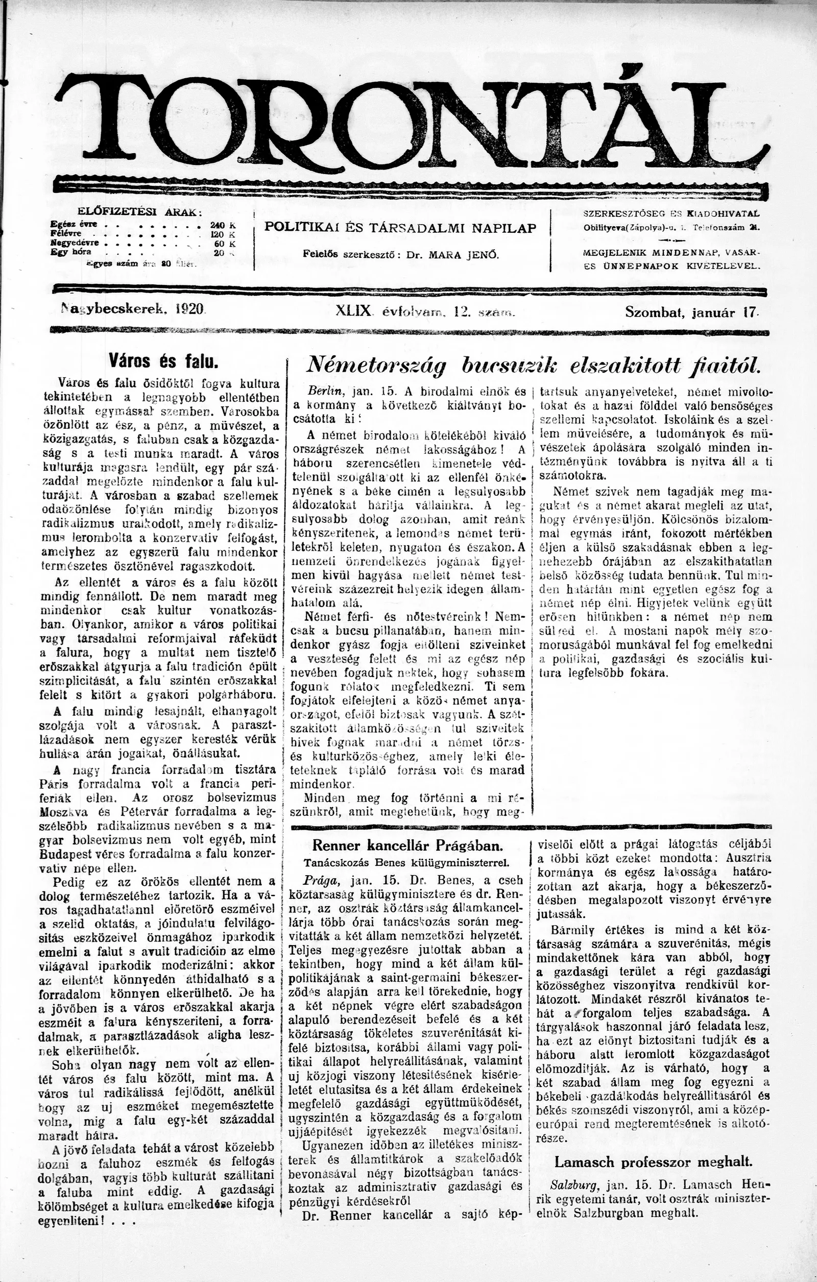 Torontál, 49. évf. 1920. január 17. 12. sz.