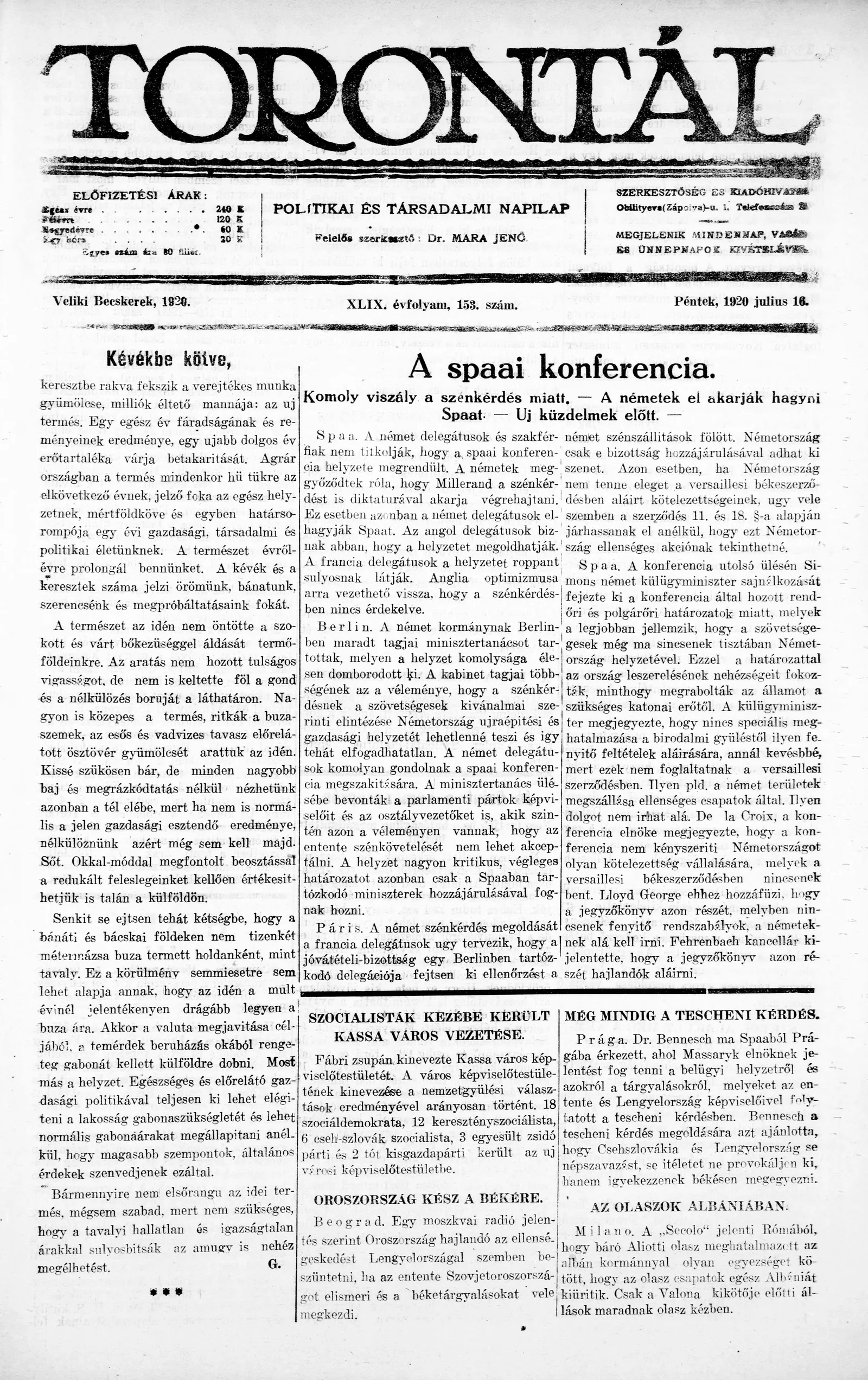 Torontál, 49. évf. 1920. július 16. 153. sz.
