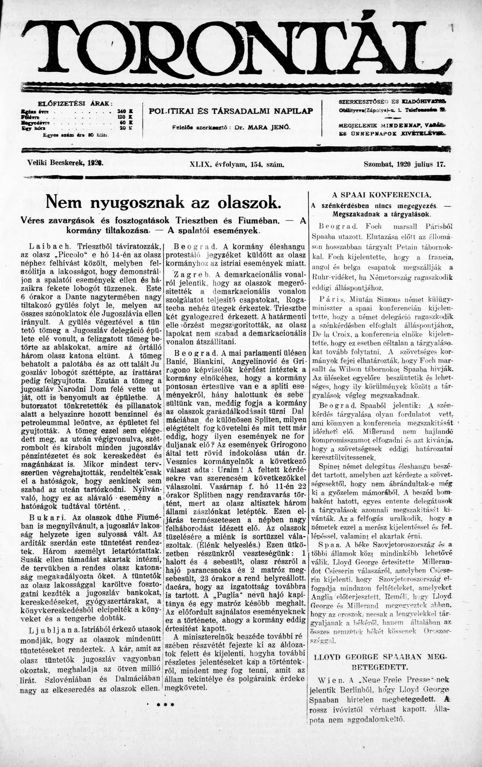 Torontál, 49. évf. 1920. július 17. 154. sz.