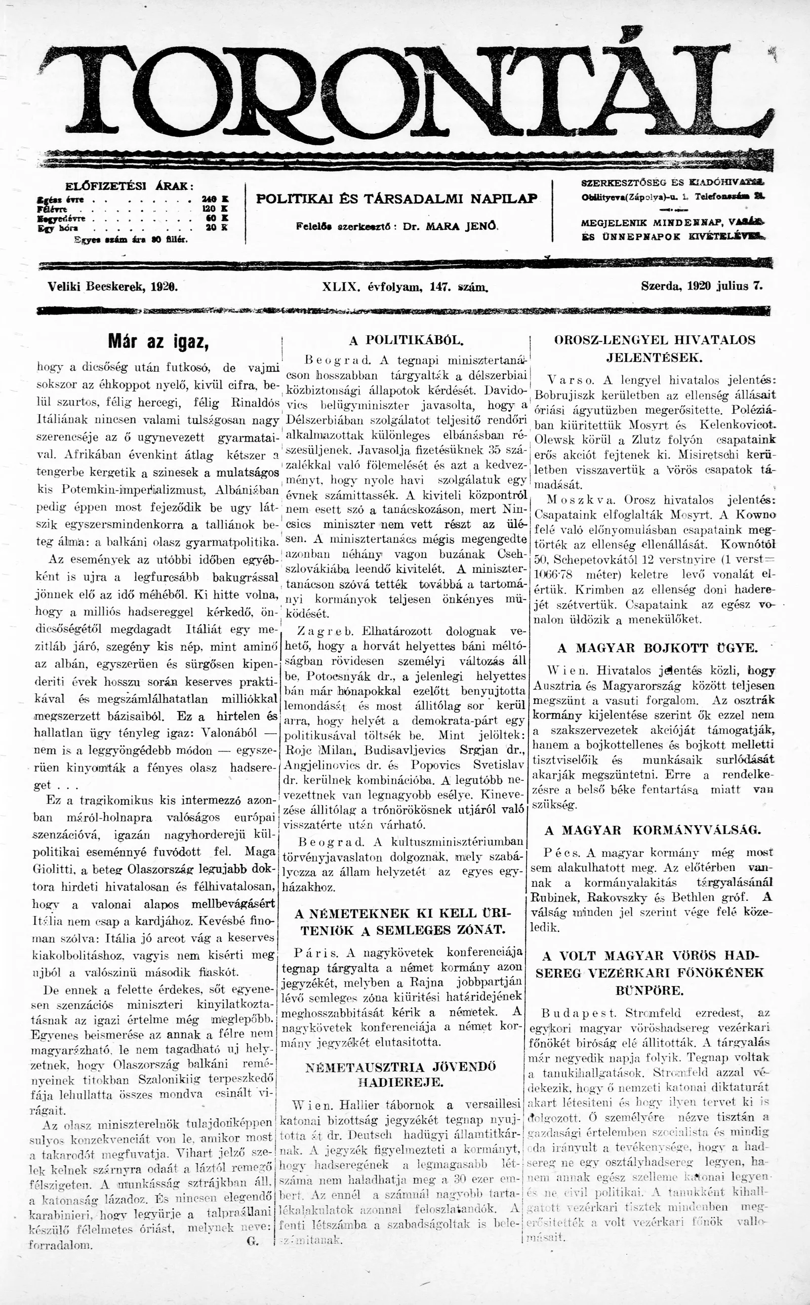 Torontál, 49. évf. 1920. július 7. 147. sz.