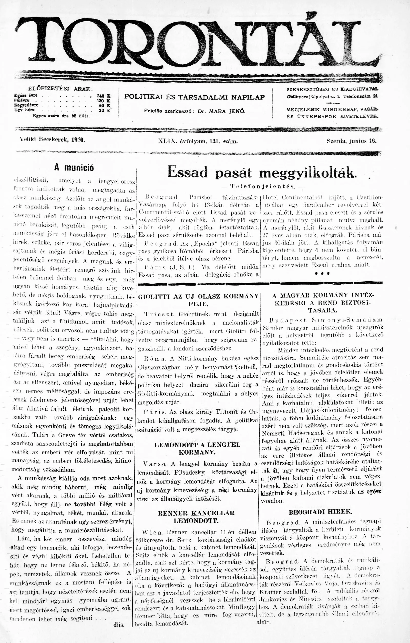 Torontál, 49. évf. 1920. június 16. 131. sz.