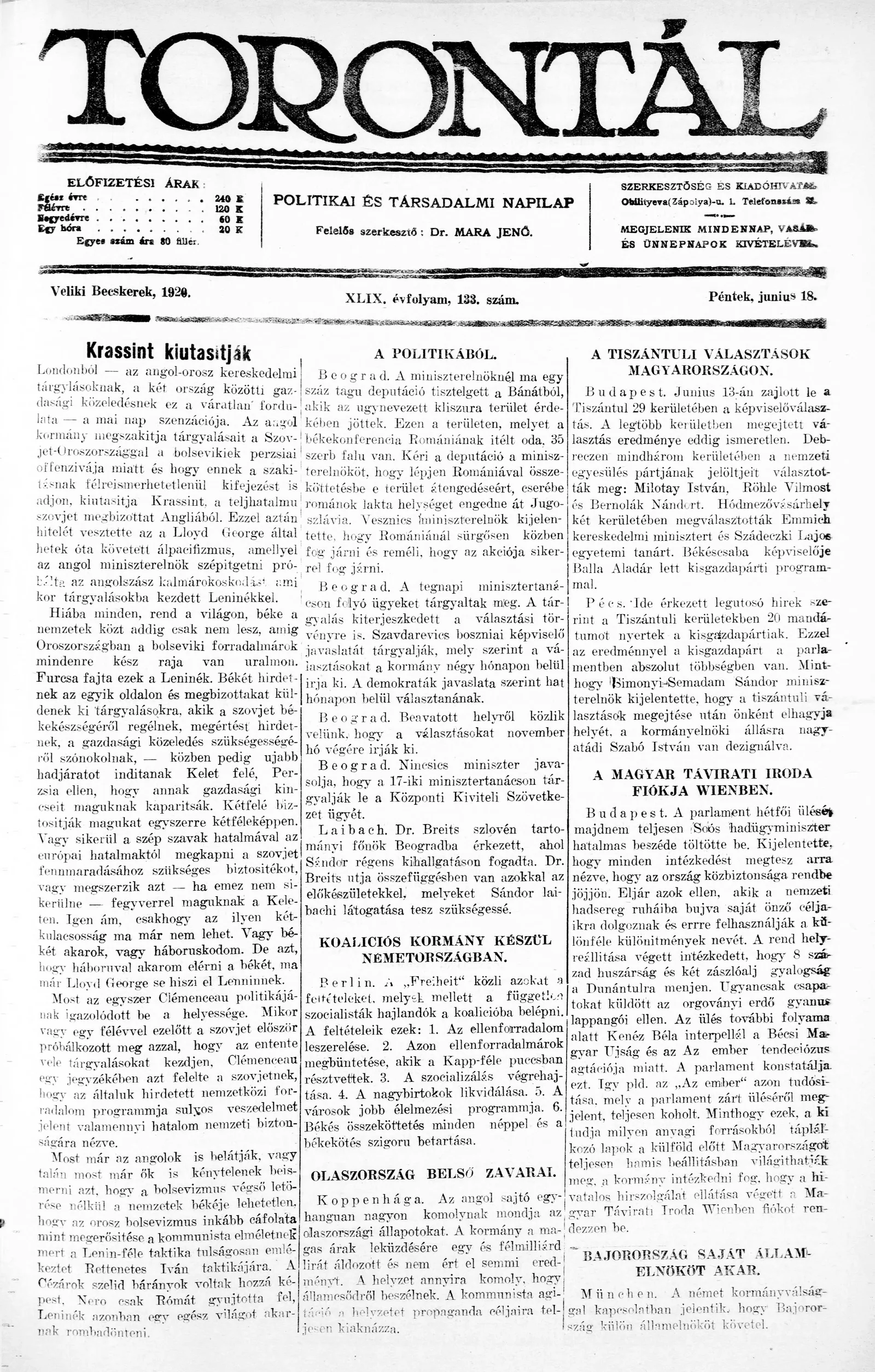 Torontál, 49. évf. 1920. június 18. 133. sz.