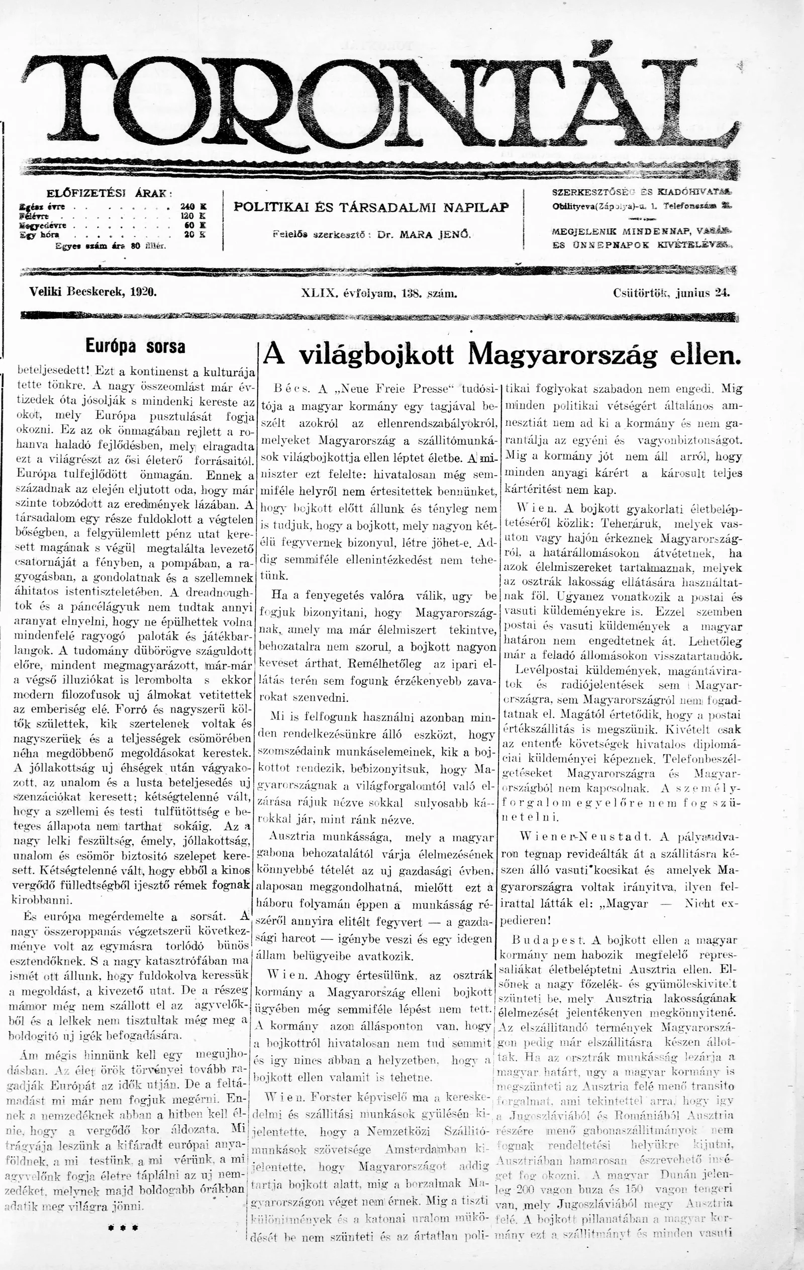 Torontál, 49. évf. 1920. június 24. 138. sz.