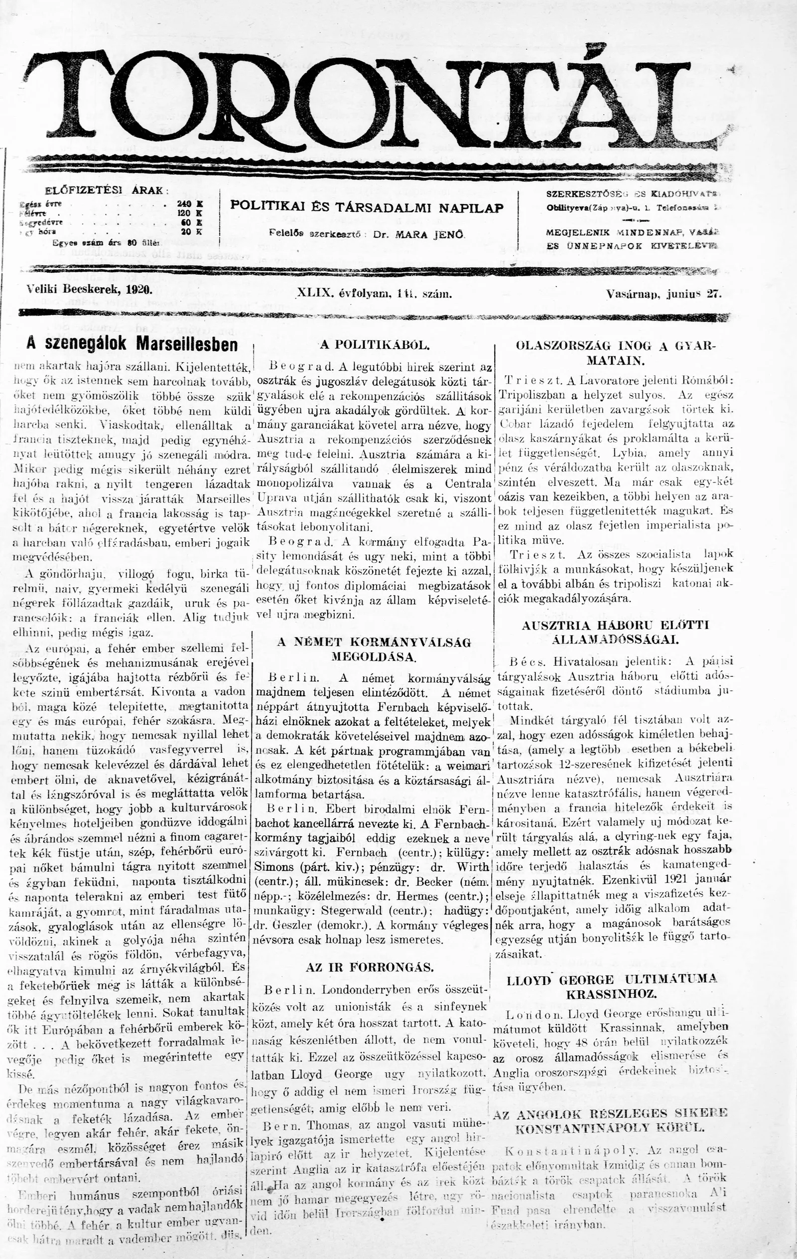 Torontál, 49. évf. 1920. június 27. 141. sz.