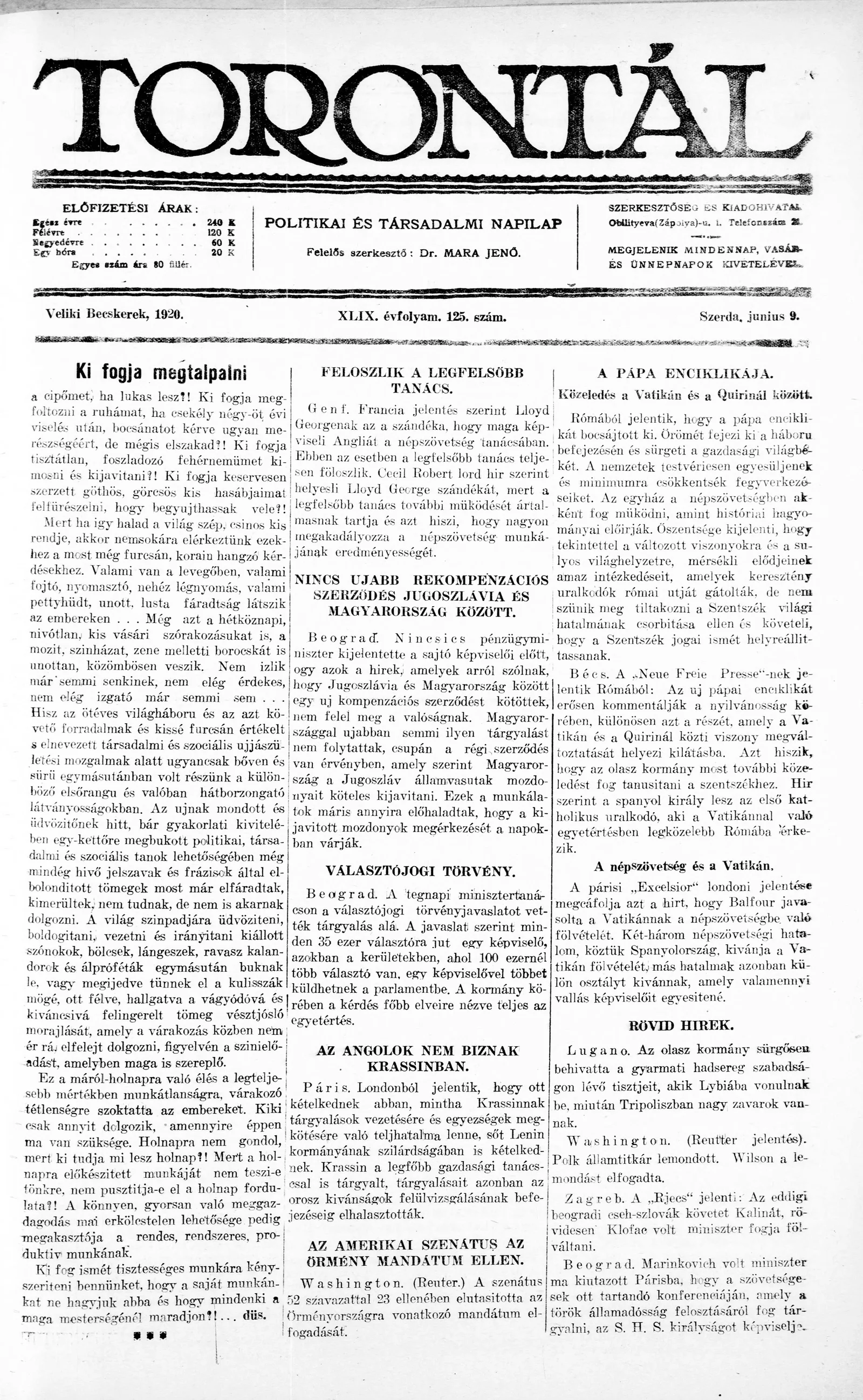 Torontál, 49. évf. 1920. június 9. 125. sz.