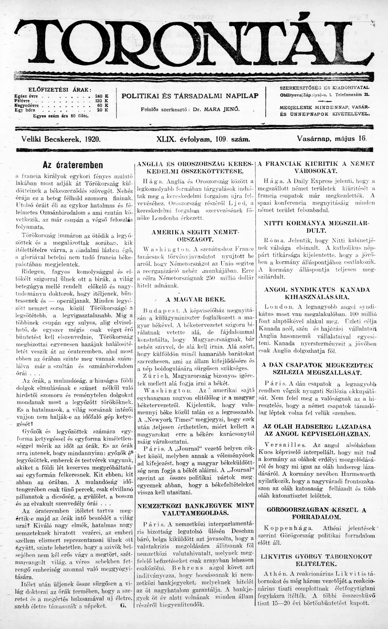 Torontál, 49. évf. 1920. május 16. 109. sz.
