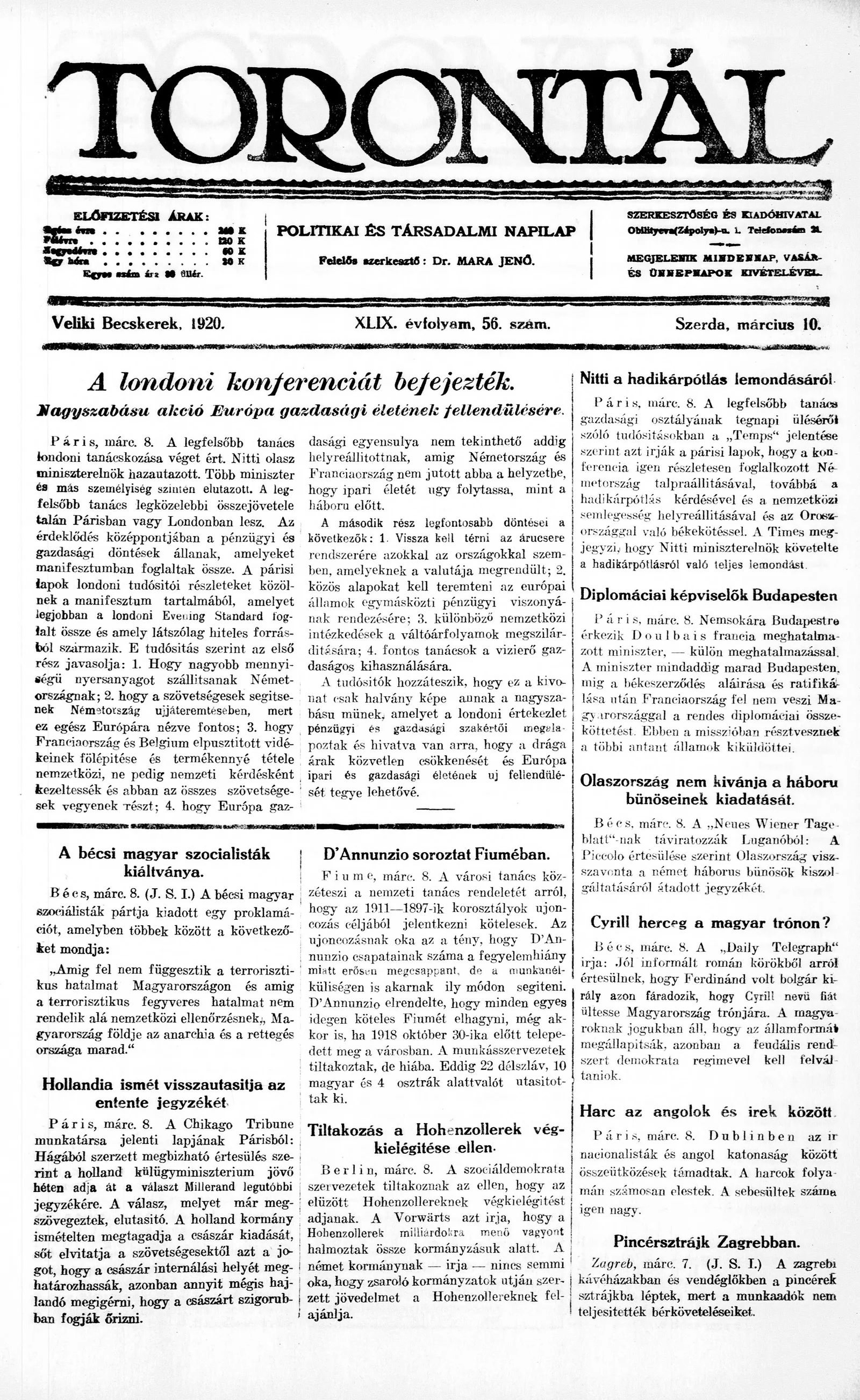 Torontál, 49. évf. 1920. március 10. 56. sz.