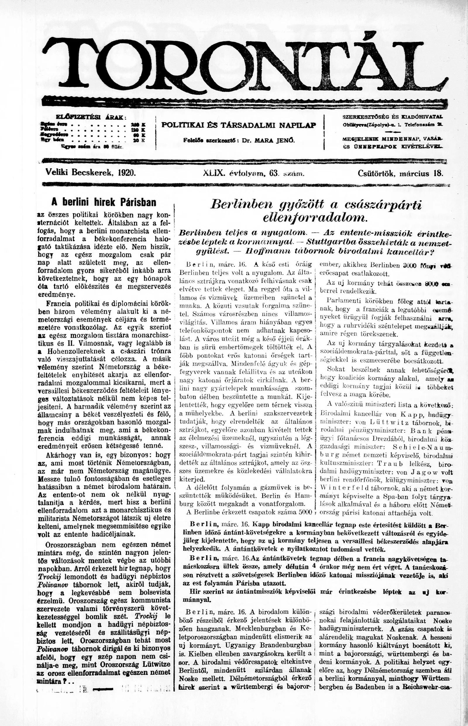 Torontál, 49. évf. 1920. március 18. 63. sz.