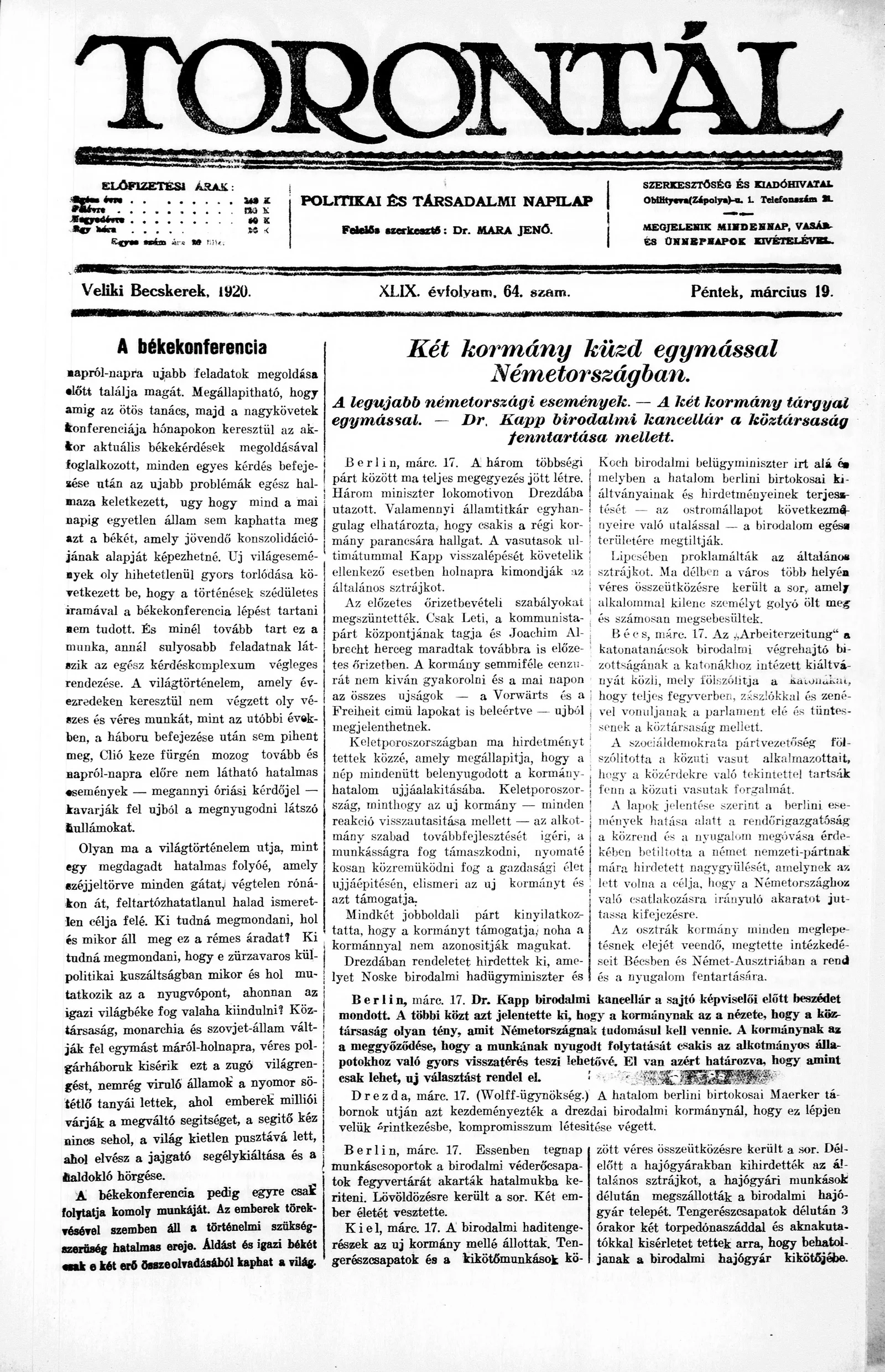 Torontál, 49. évf. 1920. március 19. 64. sz.