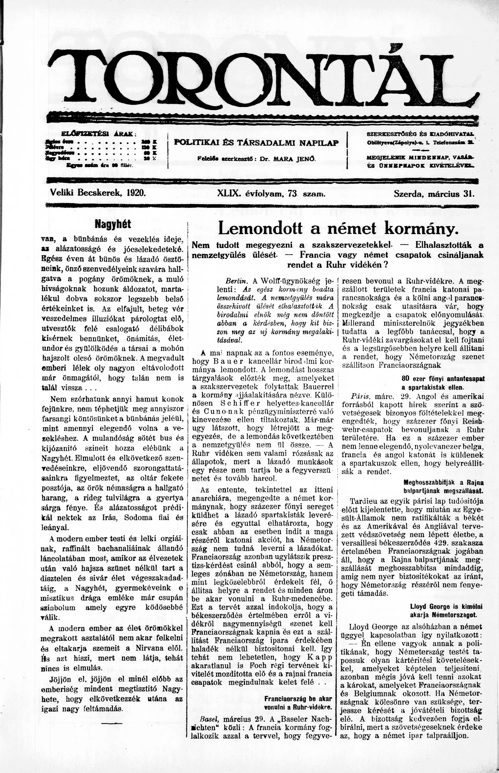 Torontál, 49. évf. 1920. március 31. 73. sz.
