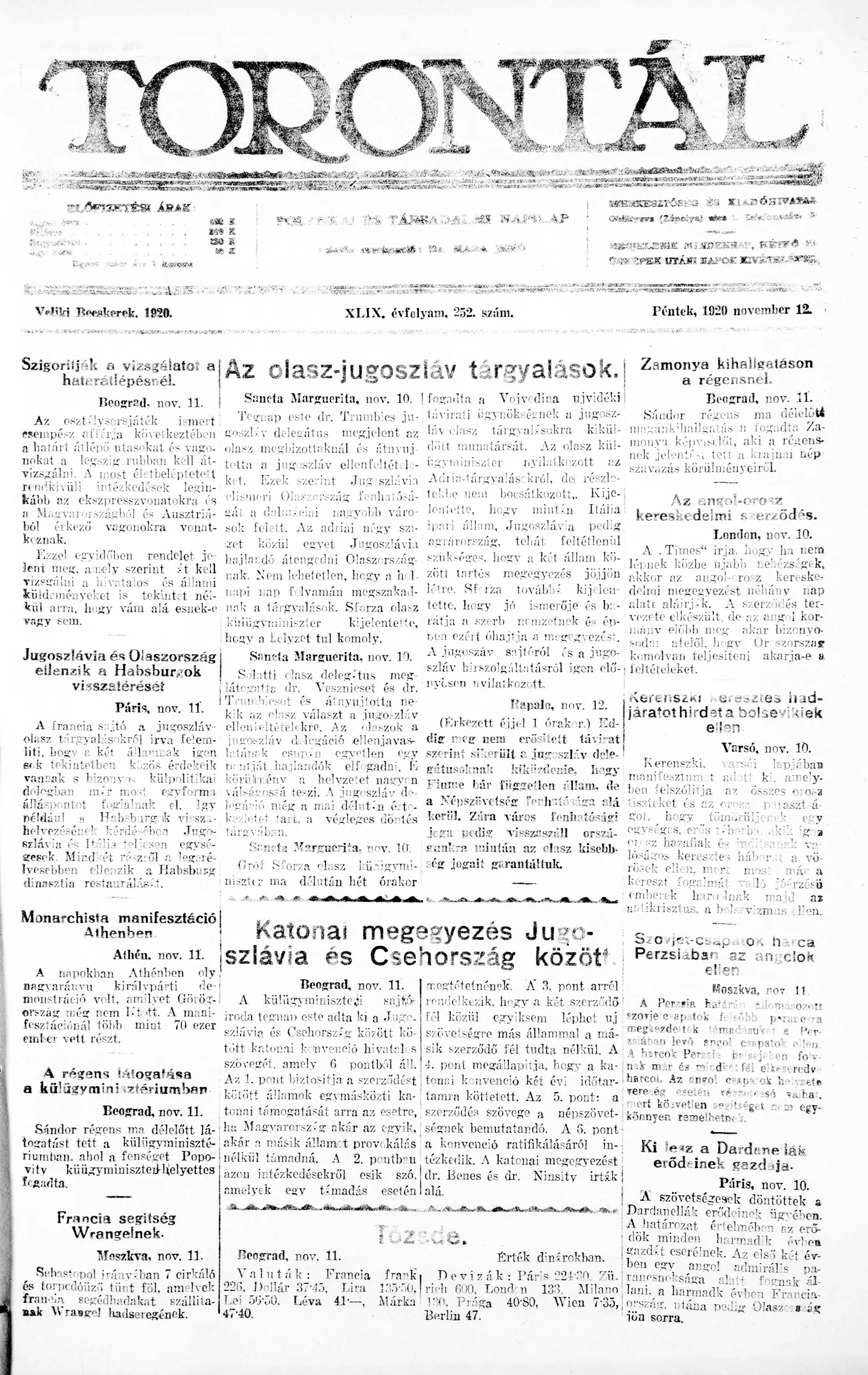 Torontál, 49. évf. 1920. november 12. 252. sz.