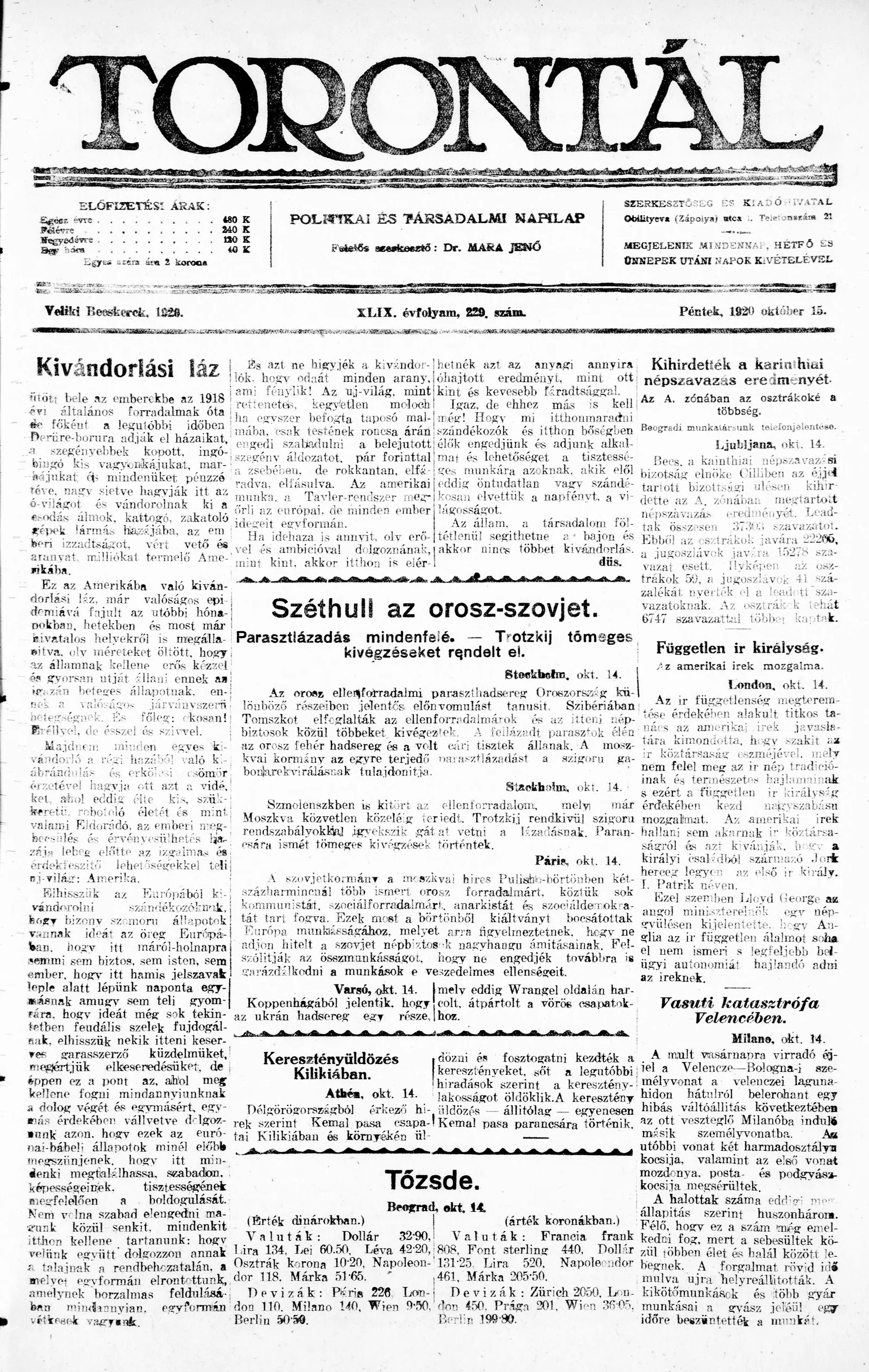 Torontál, 49. évf. 1920. október 15. 229. sz.
