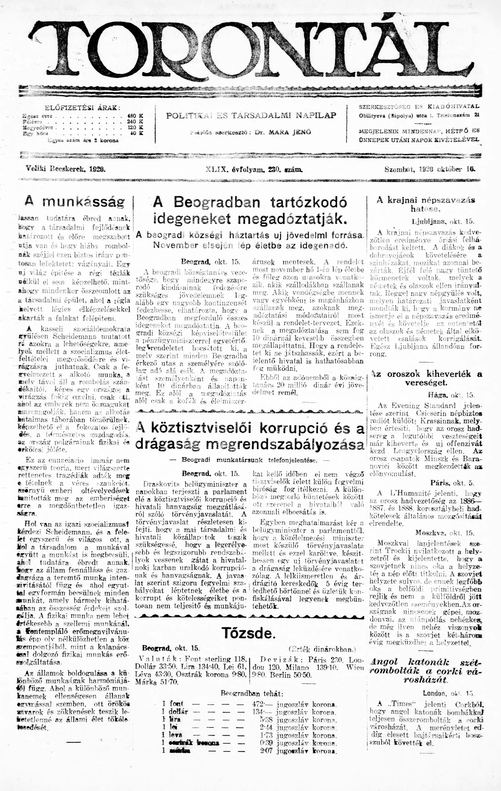 Torontál, 49. évf. 1920. október 16. 230. sz.
