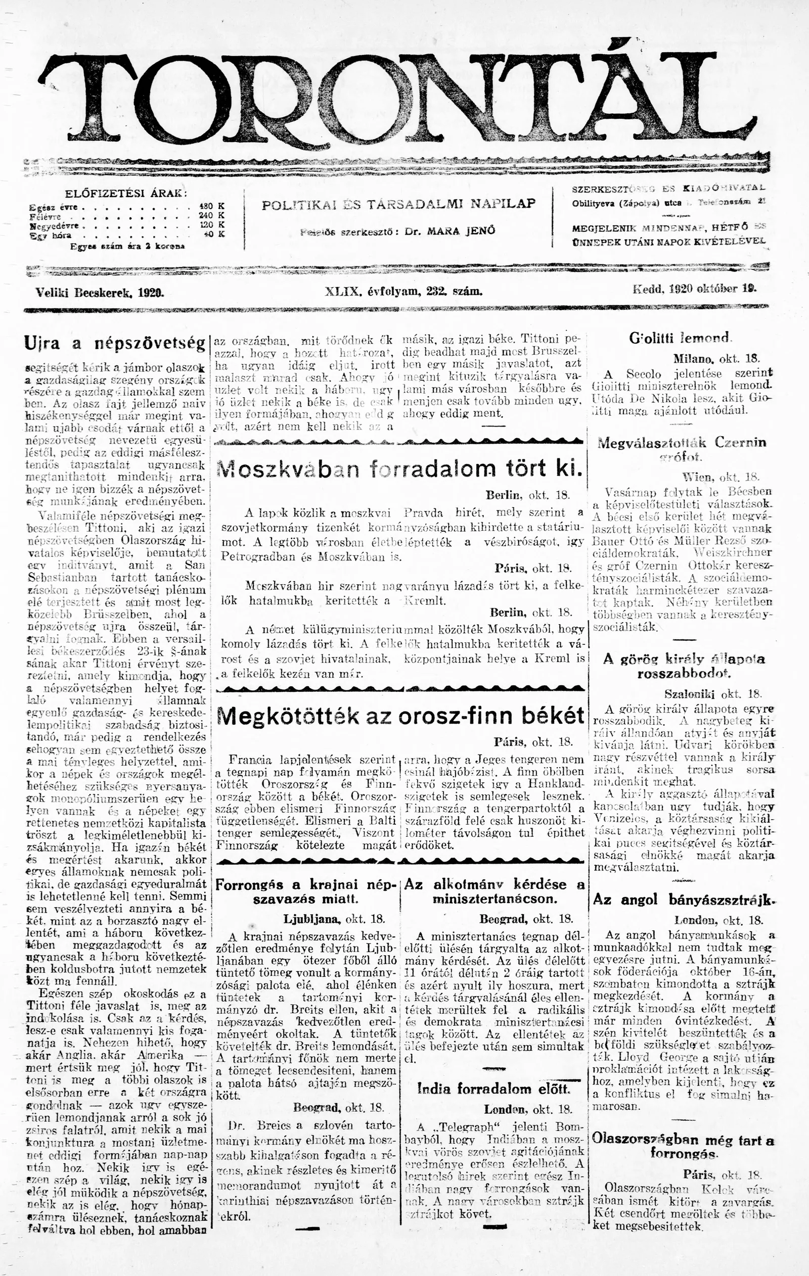 Torontál, 49. évf. 1920. október 19. 232. sz.