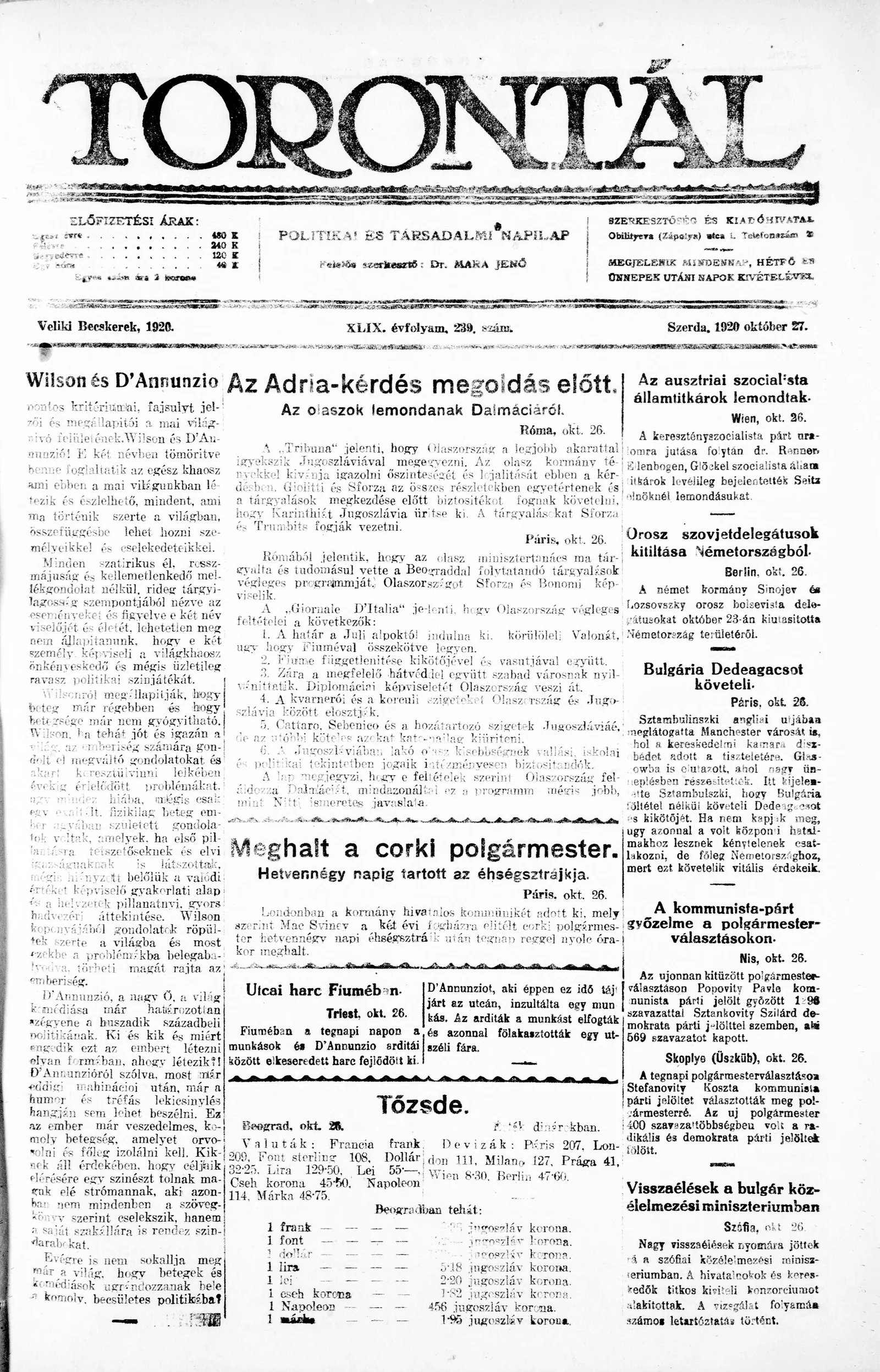 Torontál, 49. évf. 1920. október 27. 239. sz.