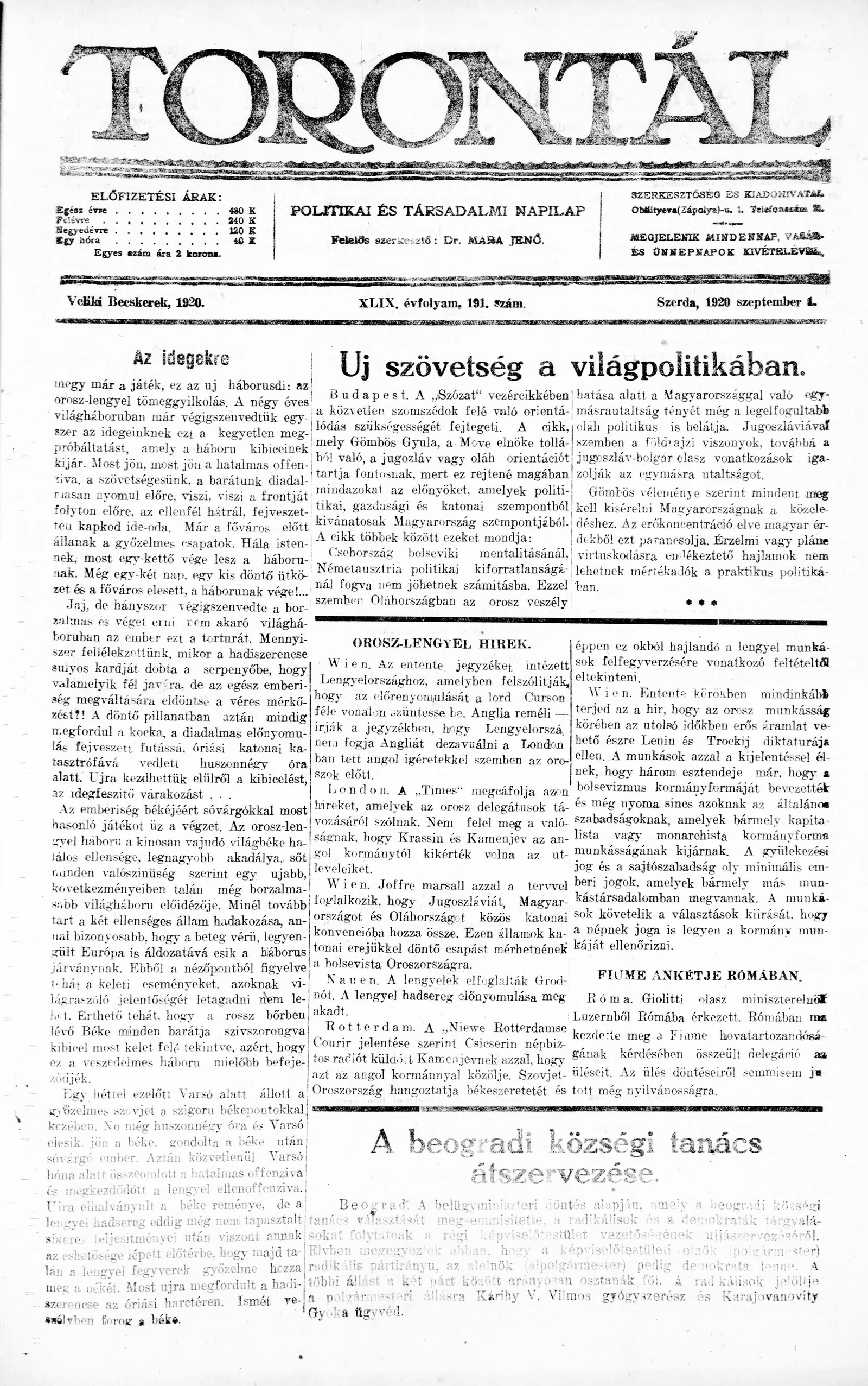 Torontál, 49. évf. 1920. szeptember 1. 191. sz.