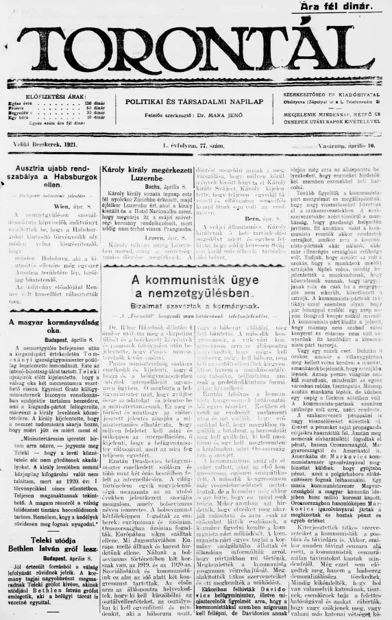 Torontál, 50. évf. 1921. április 10. 77. sz.