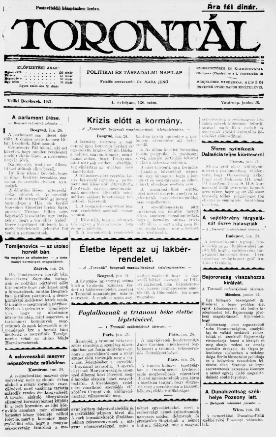 Torontál, 50. évf. 1921. június 26. 138. sz.