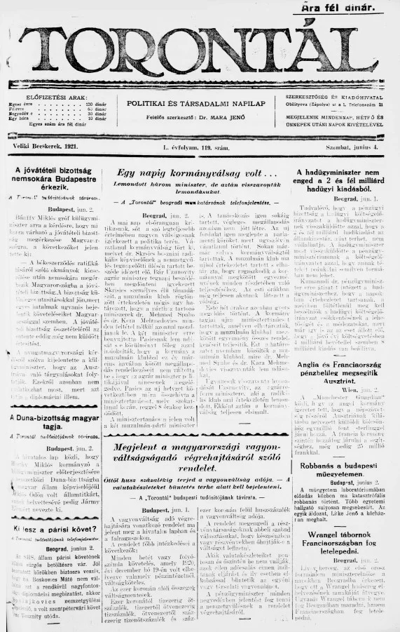Torontál, 50. évf. 1921. június 4. 119. sz.