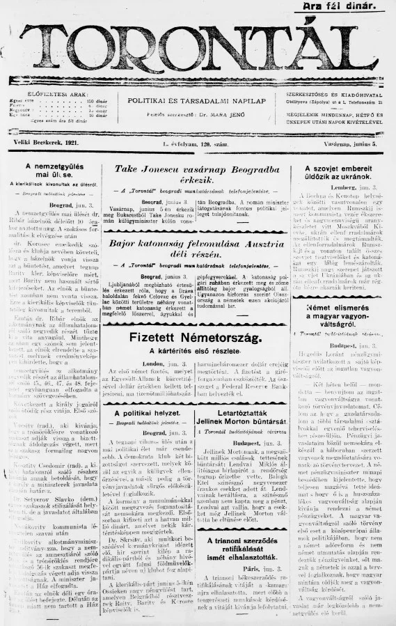 Torontál, 50. évf. 1921. június 5. 120. sz.