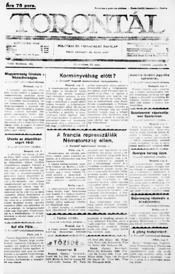 Torontál, 51. évf. 1922. augusztus 10. 175. sz.