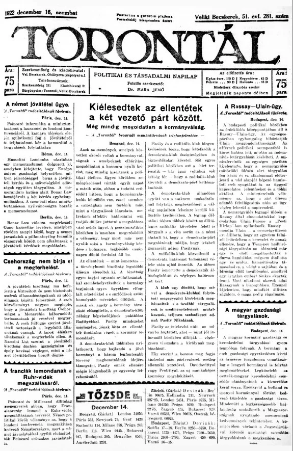 Torontál, 51. évf. 1922. december 16. 281. sz.